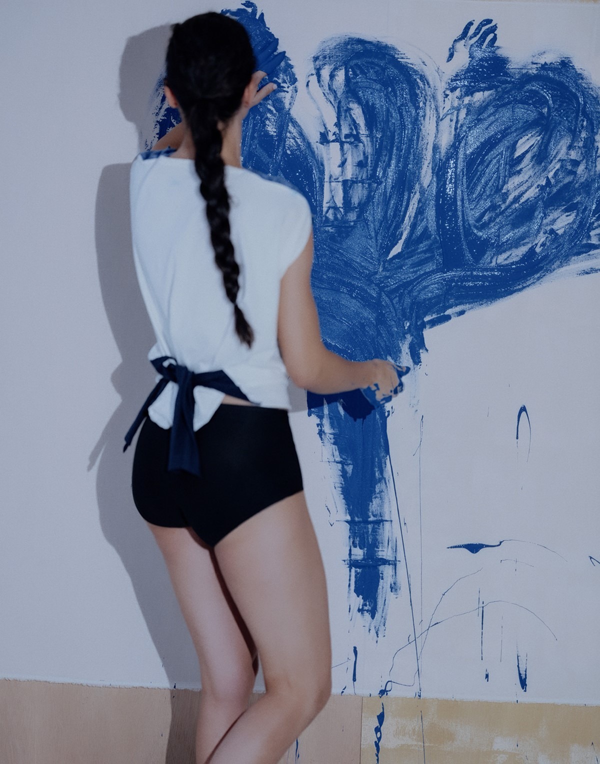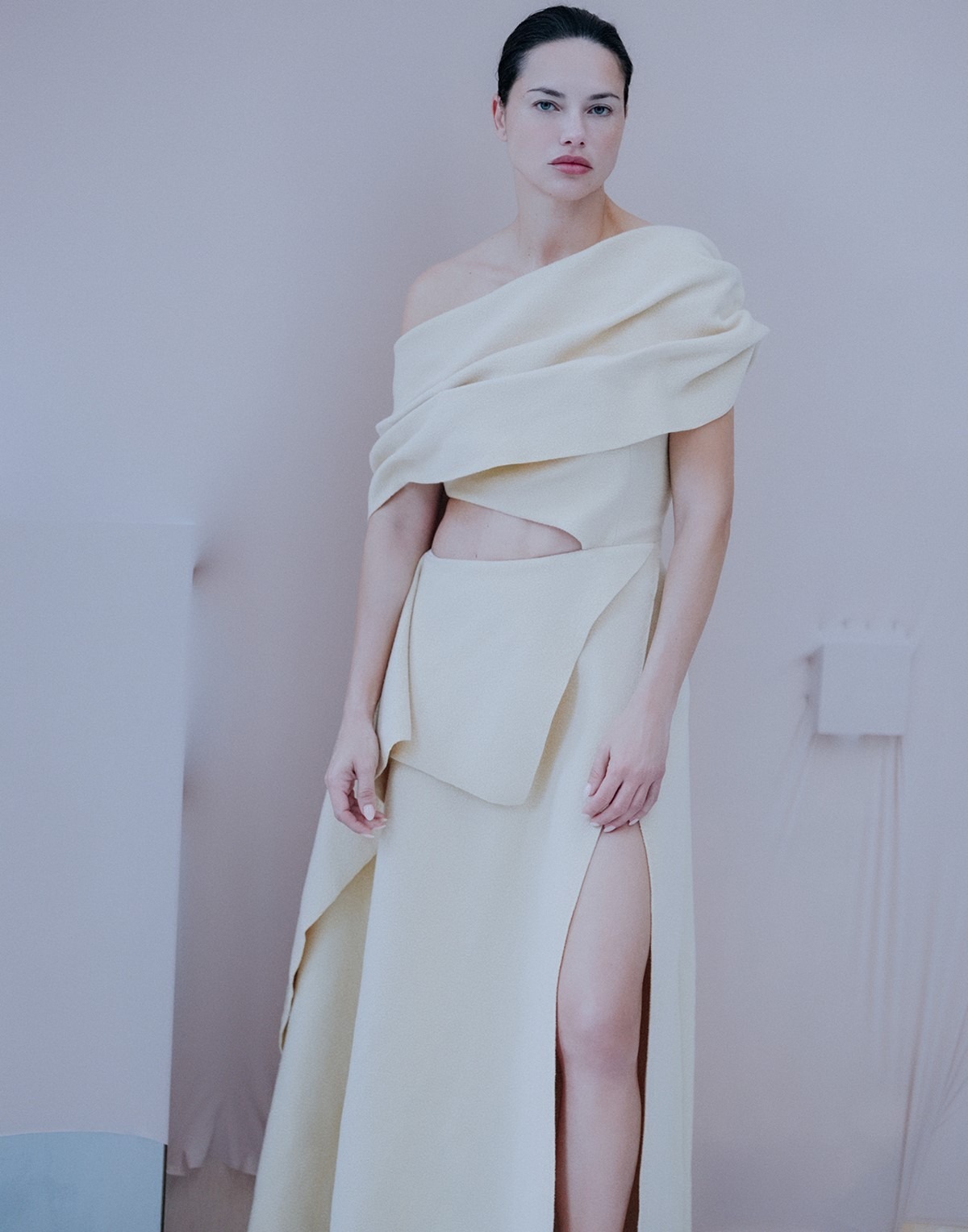 As we marvel at the phenomenon that is Adriana Lima and discuss how she has remained relevant all these years, our fashion director, Taylor Angino, sums it up perfectly: she’s “one in a billion.” And truly – Adriana Lima belongs to more than just one era; she has achieved far more than the fleeting brilliance typical of fashion fame. She has become timeless. The answer to how she has navigated every trap and challenge, surpassing the tests of relentless time, soon revealed itself before our eyes. It was enough to simply watch her on set. Her ease, intimacy, and laughter echoing through the walls melted away the last icy shard of untouchability that I had once projected onto her. “She’s an artist, but also a work of art,” Taylor tells me as we watch her dip her hands into a bucket of blue paint, smearing it across a white canvas and leaving abstract traces of her movements. As she does this, she looks like she is dancing – unrestrained and free, unbothered by the thick blue paint slipping endlessly from her hands. With equal amounts of dedication and presence, she approaches every photograph, surrendering to her creativity, exploring, and having fun. How unusual, I thought to myself, that people with years of experience often become more rigid, as if the repetition of similar actions steals the curiosity that comes with the magic of the new. I sometimes feel that myself, and yet she does something entirely different. She laughs and listens, allowing herself to be free, as if a large part of her magic lies in having preserved the little girl within her – that childlike joy so many of us inadvertently lose along the way, trying to survive the storms and shipwrecks of adult life.