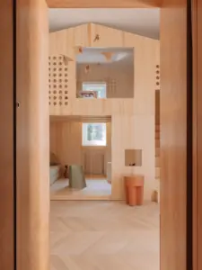 That is why this house within the apartment is the detail that sets this Sarajevo refuge apart from the mass of contemporary interiors, thoughtful, sustainable, and above all playful. “This space is for children and their friends, the future of our society. We hope it will inspire deep respect for wood, craftsmanship, and sustainability.”