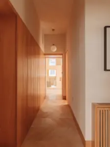 Minimalism here is not cold, quite the opposite, and what is key to the project is a sense of groundedness, expressed through a continuous wall element of natural cherry veneer that rises from the floor and wraps around the entire apartment at varying heights. Reminiscent of the horizon line, this seamless wooden element evokes a miniature forest, connecting the inhabitants of the home to the earth and nature, blending functionality with poetry and creating a calming atmosphere, the architects say.