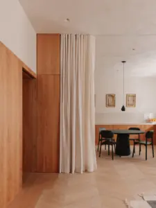 The kitchen and living room form a single, light-filled space in which floor-to-ceiling linen curtains allow for fluid adjustment between intimacy and openness, while discreetly hiding within cabinets when needed. I look at the photographs and feel a pleasant, subtle, gentle theater, where transformation plays the leading role, one that modern people of our time truly appreciate, do they not? But let us return to play.