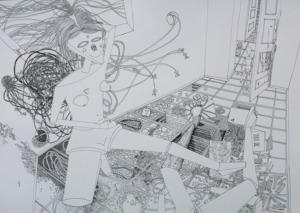 As part of the exhibition Memory of Miss Pogany, Dunja Ćorlomanović presents her artistic practice through a selection of drawings ranging from realistic depictions to abstract concepts, executed in rapidograph or fineliner on paper, created over the past two years. The scenes depicted are either documentary in nature (bars and rooms) or emotional (ropes of hair, hearts, wooden figures/dolls), often with a touch of absurdity. The formal conventions of Ćorlomanović’s drawings are reflected in meticulous attention to detail (seen in the repetitive, meditative repetition of movements and strokes), contour drawing with an emphasis on unbroken lines, inverse perspective (highlighting the internal meaning rather than external appearance), the balance of light and dark that organizes the composition and emphasizes relational dynamics, while the unreal proportions underscore the significance of the depicted subject. Exaggerated physical traits (enormous hair) and the distinctiveness of certain forms (wooden dolls instead of people) convey emotions and make the messages more legible. Compositions can be symmetrical or asymmetrical, but thanks to the balance of full and empty spaces, their arrangement is always harmonious.