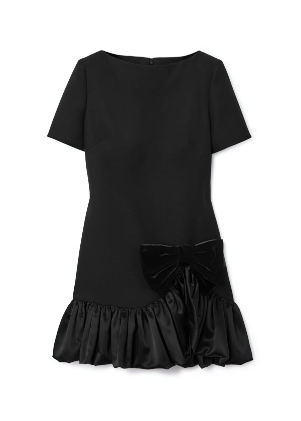 Even though our friends have seen us in every possible version of ourselves, including the unflattering ones, and know that all those versions are still just us, it’s nice to dress up sometimes and enjoy it. For a holiday dinner with friends, whether you’ve booked a restaurant table or you’re meeting at someone’s place, a little black dress with a twist is a perfect choice, a bow, a balloon hem, statement shoulders. Gold hoop earrings and a headband add a charming retro touch.