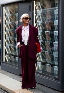 Business dinners and cocktail events are a chance to wear something a bit more relaxed than your usual office look and play with color or an unexpected detail. If you’d still like to stay within a formal dress code, a great way to add a subtle funky touch is to choose a suit in a festive burgundy or deep aubergine shade. A red bag gives it that final lift.