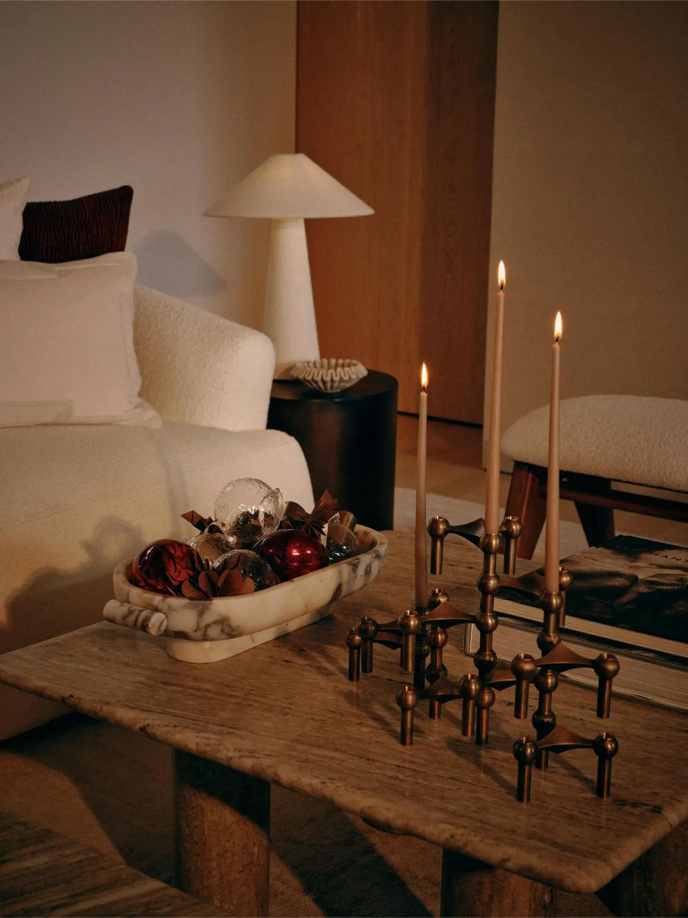 I must admit, I never thought of marble as a “holiday” material. But Delia convinced me otherwise. Marble gives decor a calm, luxurious character. A small bowl filled with ornaments, fruit or walnuts is one of my favourite quick December decorations, she explains. I bought a small marble bowl and filled it with ornaments in burgundy tones. It became the detail that makes everyone who walks into my apartment say, This looks lovely. Marble is strong and perhaps that is why it evokes a sense of ultimate luxury. It is a material that carries the history of entire civilizations. When it comes to holiday decoration, I realised that it speaks of permanence and continuity, and with it you simply cannot go overboard.