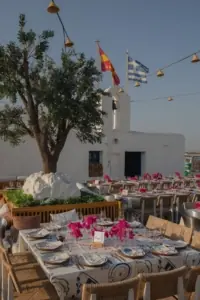 Slavlje je započelo intimnom večerom uz more u Siparosu u četvrtak navečer, a sljedećeg dana uslijedila je večera dobrodošlice u Barbarossi, restoranu na rivi u Naoussi. “Glavna ceremonija održala se u crkvi Agios Ioannis Detis, grčko-pravoslavnom samostanu koji dramatično stoji na stijenama iznad zaljeva, dok je prijem bio u Monastiri Beach Clubu, tik ispod crkve,” kaže Buggy. “Gosti su dolazili u crkvu tradicionalnim ribarskim brodovima kaïki, okićenima bugenvilijama, uz pratnju lokalnog cikladskog benda koji je svirao grčku svadbenu glazbu.”