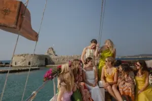 Na dan vjenčanja, gosti su stigli brodovima do crkve Agios Ioannis Detis, gdje su čekali mladenku. “Došla sam posljednjim brodom, okružena najbližim prijateljima i obitelji,” priča Buggy. “Prijateljice su mi pjevale Going to the Chapel dok smo se približavale obali. Kasnije smo saznale da su nas svi u crkvi čuli, zato su nas dočekali s tolikim pljeskom i povicima. Mattias je stajao na litici, mahao i držao moj buket.”