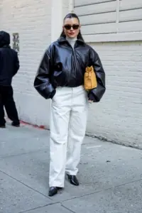 Postoji li bolji način da istaknete bijele traperice ove zime nego uz crne gležnjače? Ovo je kombinacija koja bez truda djeluje elegantno, upravo onako kako je viđamo u street styleu, gdje minimalistički lookovi posebno dobro izgledaju u prosincu. Ključ je u barrel ili balloon kroju traperica koje lijepo oblikuju figuru i daju moderniji, svježiji dojam. Spojite ih s poslovnim komadima poput klasičnog crnog blazera, visokih crnih čizama s bademastim vrhom, majicom i remenom: outfit u crno-bijeloj paleti, formalan, ali i dovoljno opušten za svaki dan.
