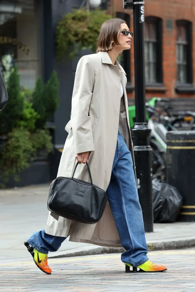 Prije nekoliko godina Hailey Bieber pojavila se u jednom od svojih klasičnih minimalističkih outfita, u predimenzioniranom kaputu, kratkoj majici i trapericama, ali vjerujem da je pažnja svih njezinih fanova bila okupirana njezinim izborom obuće. Nosila je šarene Nike Shox tenisice. Riječ je o doista nesvakidašnjem modelu – na tenisicama se stapaju žuta i narančasta boja, a stražnji dio obuće podignut je mekanim strukturnim kuglicama zbog kojih izgledaju kao da imaju petu.