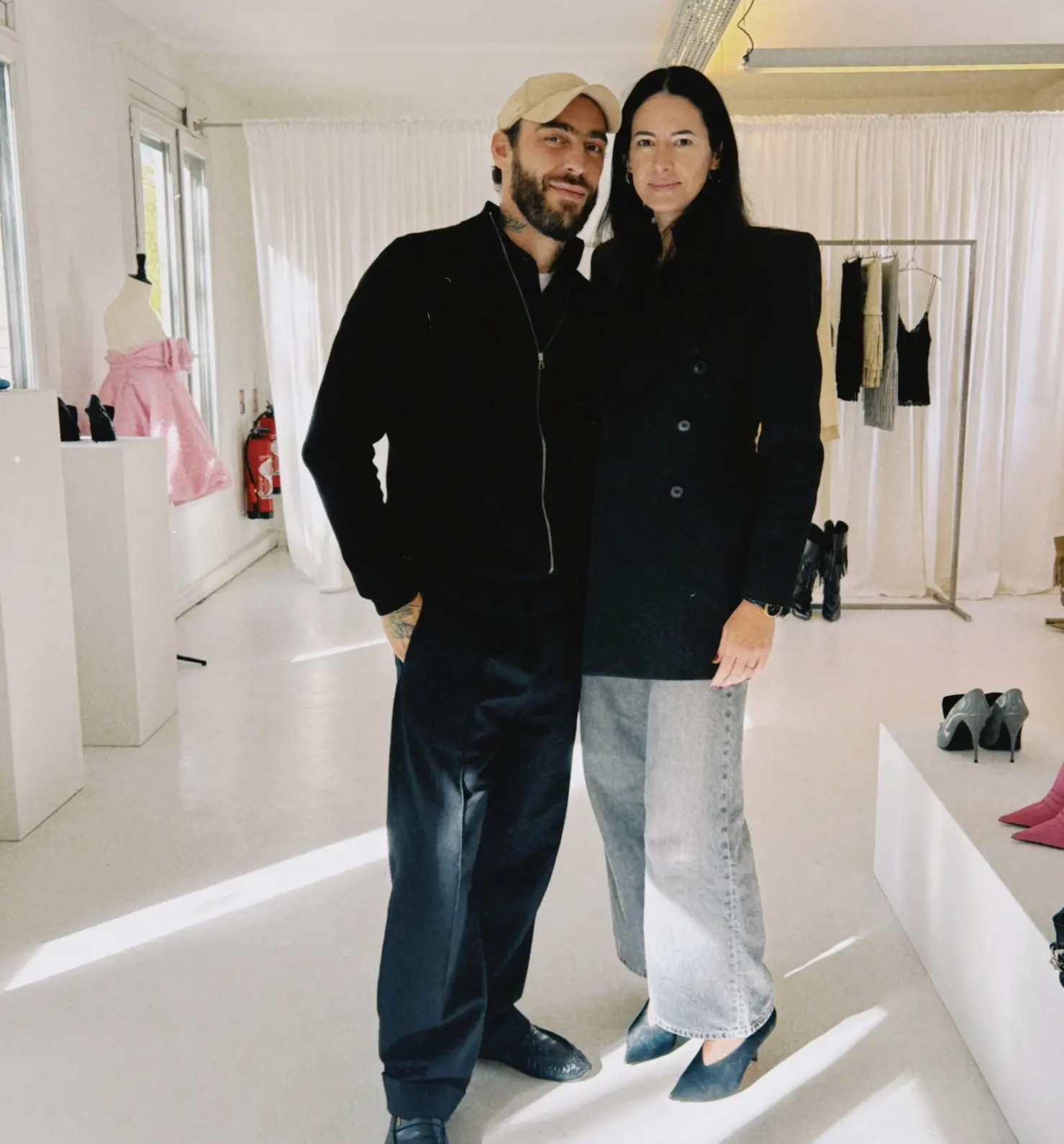 Susrećemo se u Abrovu showroomu u Parizu gdje se svjetlost izlijeva u miran, prozračan prostor u kojem boja funkcionira kao jezik, a kupci se kreću s poznatom sigurnošću. Abraham Ortuño Pérez (Abra, za sve u prostoriji) prelazi između stalaka, probnih fittinga i zagrljaja nevjerojatnom lakoćom držeći sve niti povezane. Među skulpturalnim potpeticama i satenskim mini haljinama stoji Alex Consani, ležerno isprobavajući komade kao da je to najprirodniji nastavak njezina dana. Bez pratnje, bez teatralnosti.