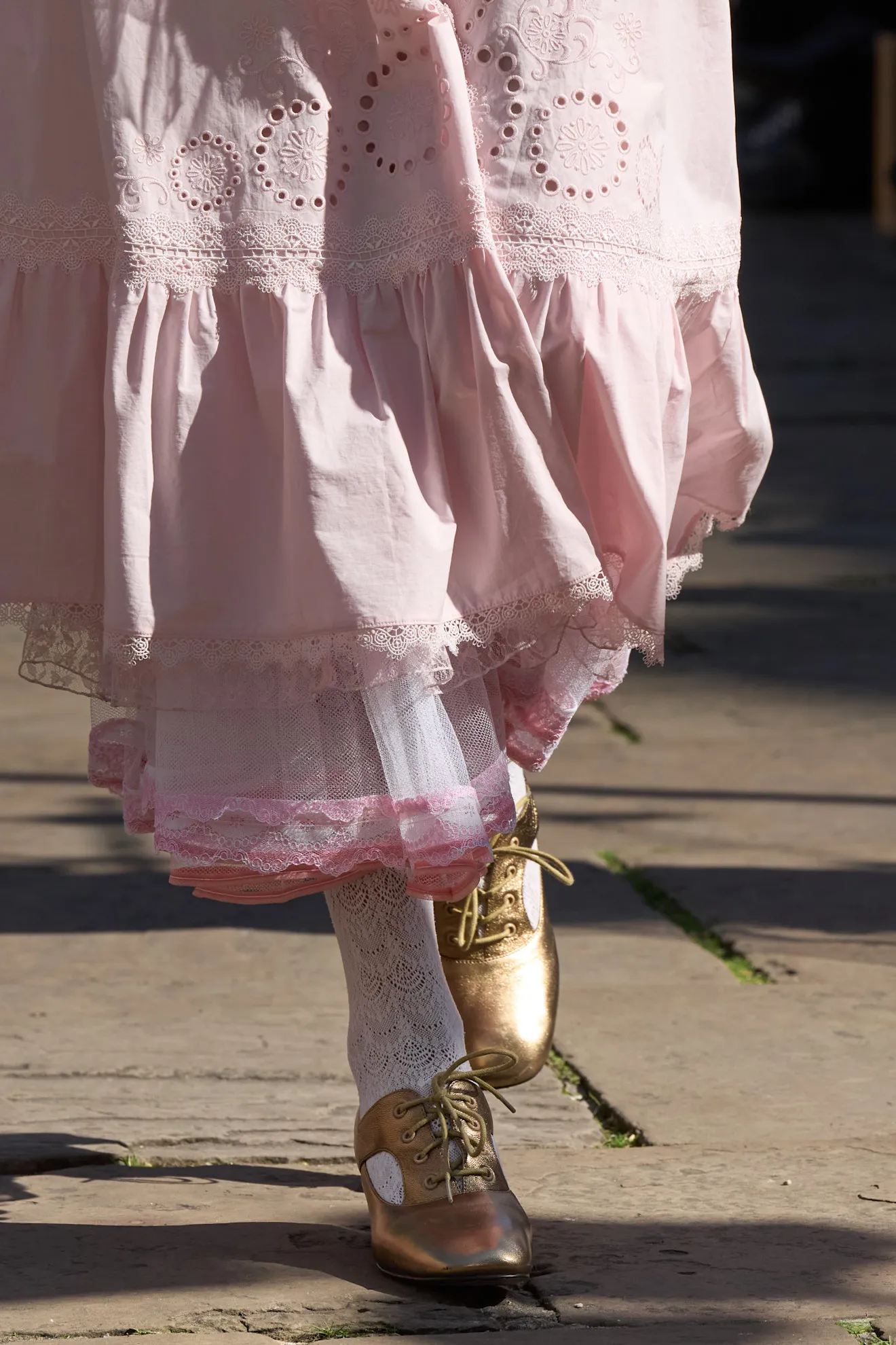 Ovaj tip cipela nosi blagi britanski štih, a u pop-kulturi se povezuje s likovima poput edvardijanskih guvernanti, Mary Poppins ili gospođice Rottenmeier, učiteljice iz Heidi. Trend za proljeće 2026. okreće se upravo toj granny verziji: na Tjednu mode u Barceloni, brend Reborn spojio je svoje vezane polučizme s haljinama s cvjetnim uzorcima, dok je Bora Aksu svoje romantične haljine i bijele čipkaste čarape upotpunio cipelama s izrezima koji prate isti smjer.