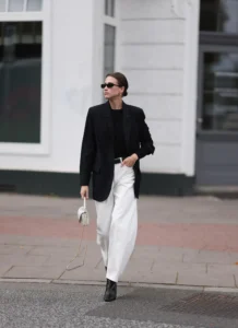 Postoji li bolji način da istaknete bijele traperice ove zime nego uz crne gležnjače? Ovo je kombinacija koja bez truda djeluje elegantno, upravo onako kako je viđamo u street styleu, gdje minimalistički lookovi posebno dobro izgledaju u prosincu. Ključ je u barrel ili balloon kroju traperica koje lijepo oblikuju figuru i daju moderniji, svježiji dojam. Spojite ih s poslovnim komadima poput klasičnog crnog blazera, visokih crnih čizama s bademastim vrhom, majicom i remenom: outfit u crno-bijeloj paleti, formalan, ali i dovoljno opušten za svaki dan.