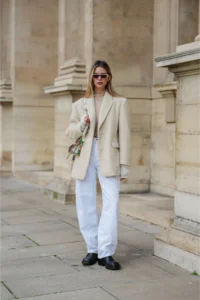 Ravne bijele traperice lako poprime ozbiljniji, pomalo maskulin izgled uz crne Chelsea gležnjače, odlična opcija ako želite izgledati drukčije u prosincu. Upotpunite kombinaciju dolčevitom i blazerom od četkane vune. Najbolje je birati komade u svijetlim nijansama smeđe, koje unose toplinu i u najtmurnije jesenske dane.
