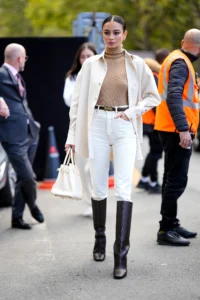 Ako smo nešto naučili od brendova poput Burberryja, Copernija i Hermèsa, to je da će jahačke čizme i dalje biti opsesija sezone jesen/zima 2025. One donose savršenu inspiraciju za drugačije kombiniranje bijelih traperica, čak i skinny modela koje neke žene nevoljko nose. Tajna je u uskom kroju traperica koji omogućuje da čizme visoke do koljena nosite preko nogavica. Dodajte tanki remen, rebrasti pulover i košulju preko: chic i funkcionalno.