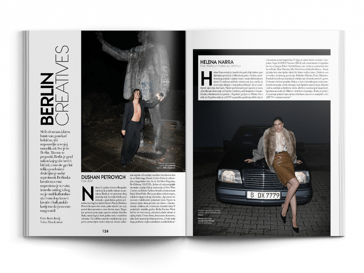 Po jednu od noćnih priča otputovali smo u Berlin – grad poznat po svojoj slobodoumnosti, iskrenosti, buntovnosti, hektičnosti i jedinstvenosti. Berlinska kreativna scena neprestano cvjeta, ponajprije zahvaljujući svojoj multikulturalnosti, kojoj značajno doprinose i kreativci balkanskih korijena. S devet istaknutih pojedinaca s berlinske modne scene razgovarala je Tina Lončar, donoseći priče o njihovim karijernim putovanjima, inspiracijama i životu u Berlinu, kao i promišljanja što grad čini toliko jedinstvenim. Noćne fotografije potpisuje Boris Kralj, koji uspješnu karijeru u modnoj fotografiji gradi u ovom gradu već više od dva desetljeća.
