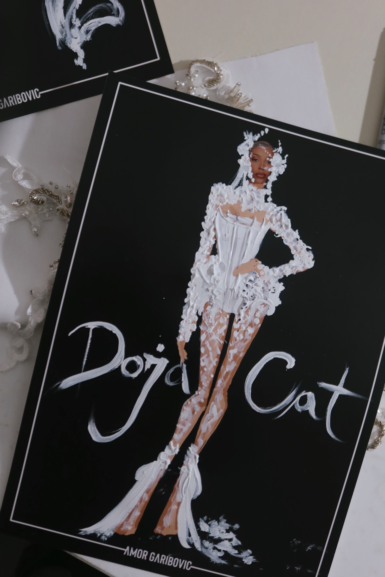 Naime, u režiji Davea Meyersa, Doja tumači ulogu odbjegle mlade, odajući svojevrsni omaž kultnim filmovima poput Hitchcockovog North by Northwest i Tarantinovog diptiha Kill Bill. Spot počinje scenom u kojoj skače padobranom prema Zemlji, bježeći od letjelice kroz polje – direktna aluzija na lik Caryja Granta u Hitchcockovom špijunskom trileru iz 1959. godine. Zatim stiže do pustinjske kapele i pleše, noseći kreaciju po mjeri Amora Garibovića, u obliku korzeta s naglašenim bokovima, ručno ukrašenim kristalima i biserima, nakon čega, poput Ume Thurman u uvodnoj sceni Kill Bill Vol. 1, strijela pogađa njezino srce. Upečatljiva kombinacija unosi prepoznatljivu skulpturalnu siluetu i besprijekorno izrađenu couture estetiku brenda u futuristički i snažan vizualni narativ spota.