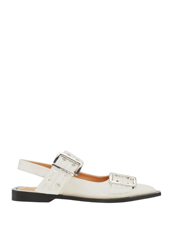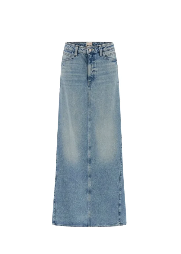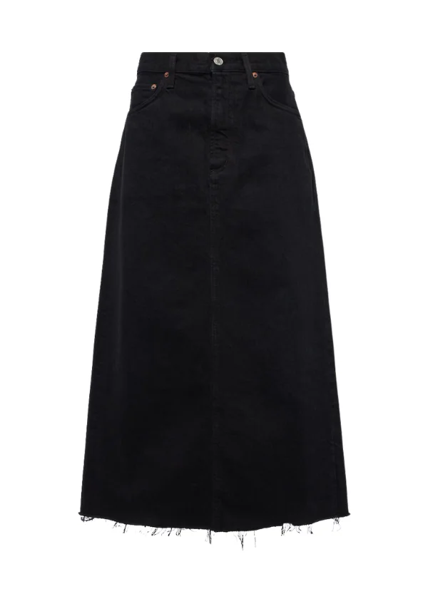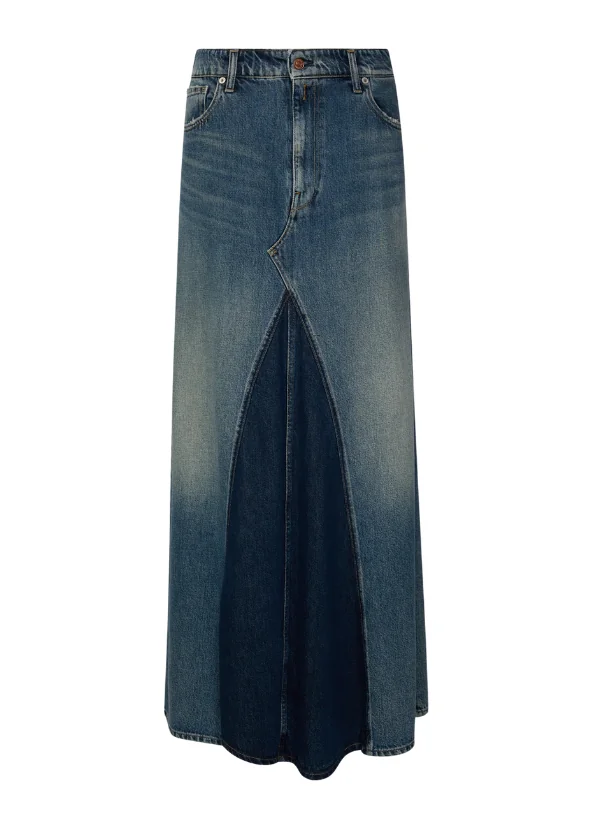 Duga traper suknja i ravne slingback cipele u istoj boji