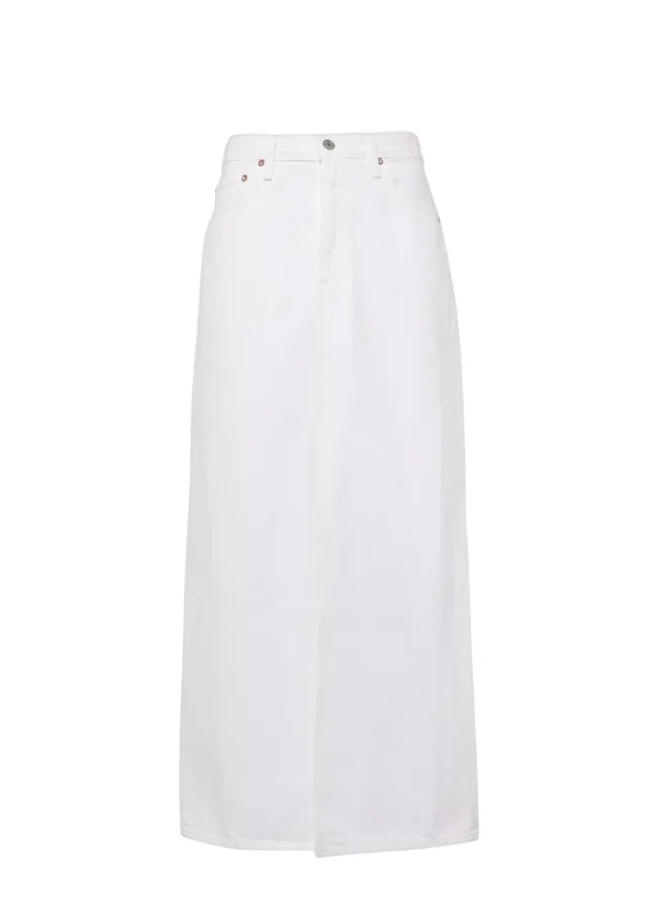 Duga bijela traper suknja i Mary Jane cipele u boji