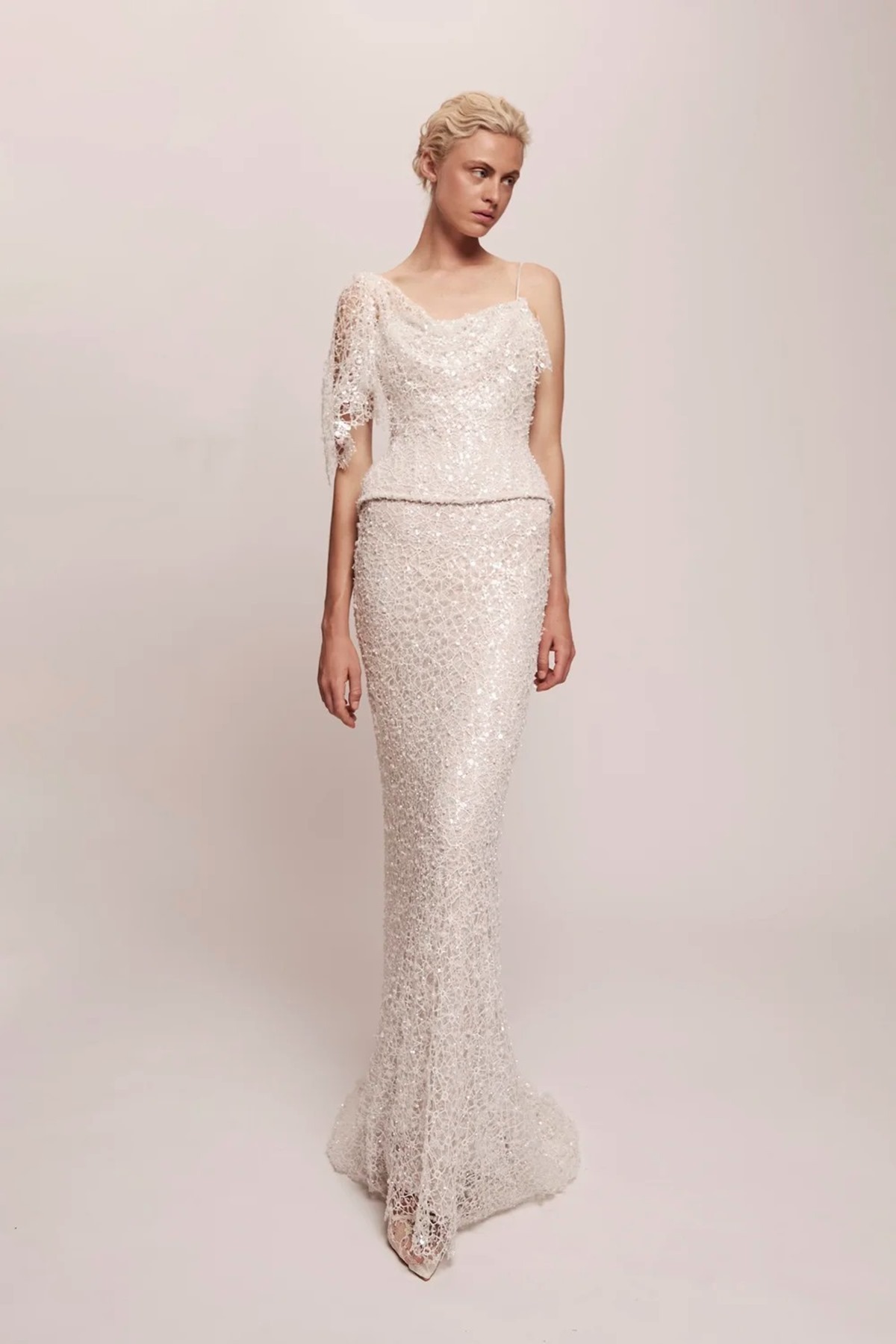 Tkanine prekrivene šljokicama, kristalima, perlama i aplikacijama vladaju bridal trendovima u 2026. godini – sve što svjetluca pod prigušenim svjetlima i donosi onaj poseban sjaj kakav priželjkujemo za tako veliku prigodu poput vjenčanja. Alduk je u svojoj bridal kolekciji predstavio dugu bijelu vjenčanicu sa sjajnim elementima koji se tkaninom šire poput korijenja stvarajući zanimljiv vizualni efekt, Jaclyn Whyte svoju je vjenčanicu prekrio sjajnom „paučinom“, dok je Markarian posegnuo za decentnim biserima.