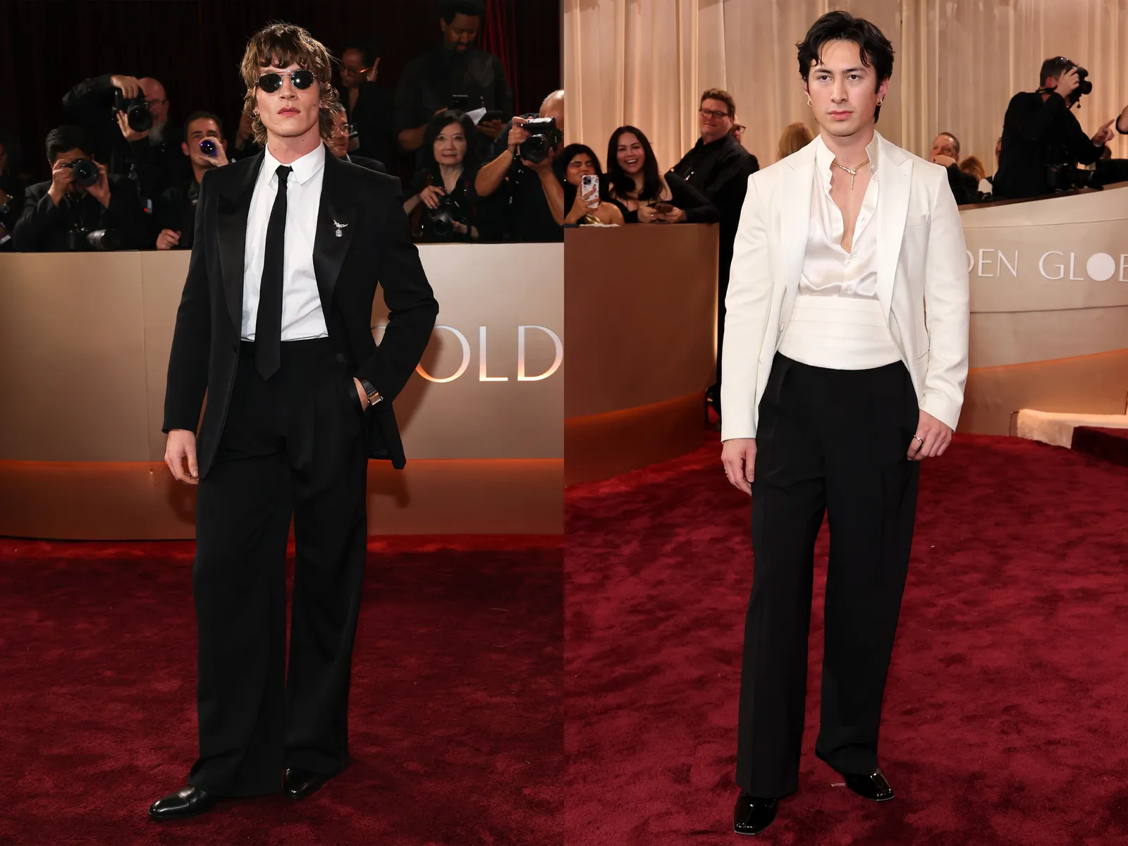 U međuvremenu, Storrie se odlučio za jednostavan look u uskom crnom odijelu Saint Laurent, upotpunjenom bezvremenskom bijelom košuljom i crnom uskom kravatom. Ipak, detalji poput zaobljenih naočala, broša i elegantnih kožnih čizama dali su cijelom stylingu mladenačku notu. Bio je to pravi “rock zvijezda na dodjeli Globusa” trenutak, a njegova razbarušena mod frizura čista je desetka.