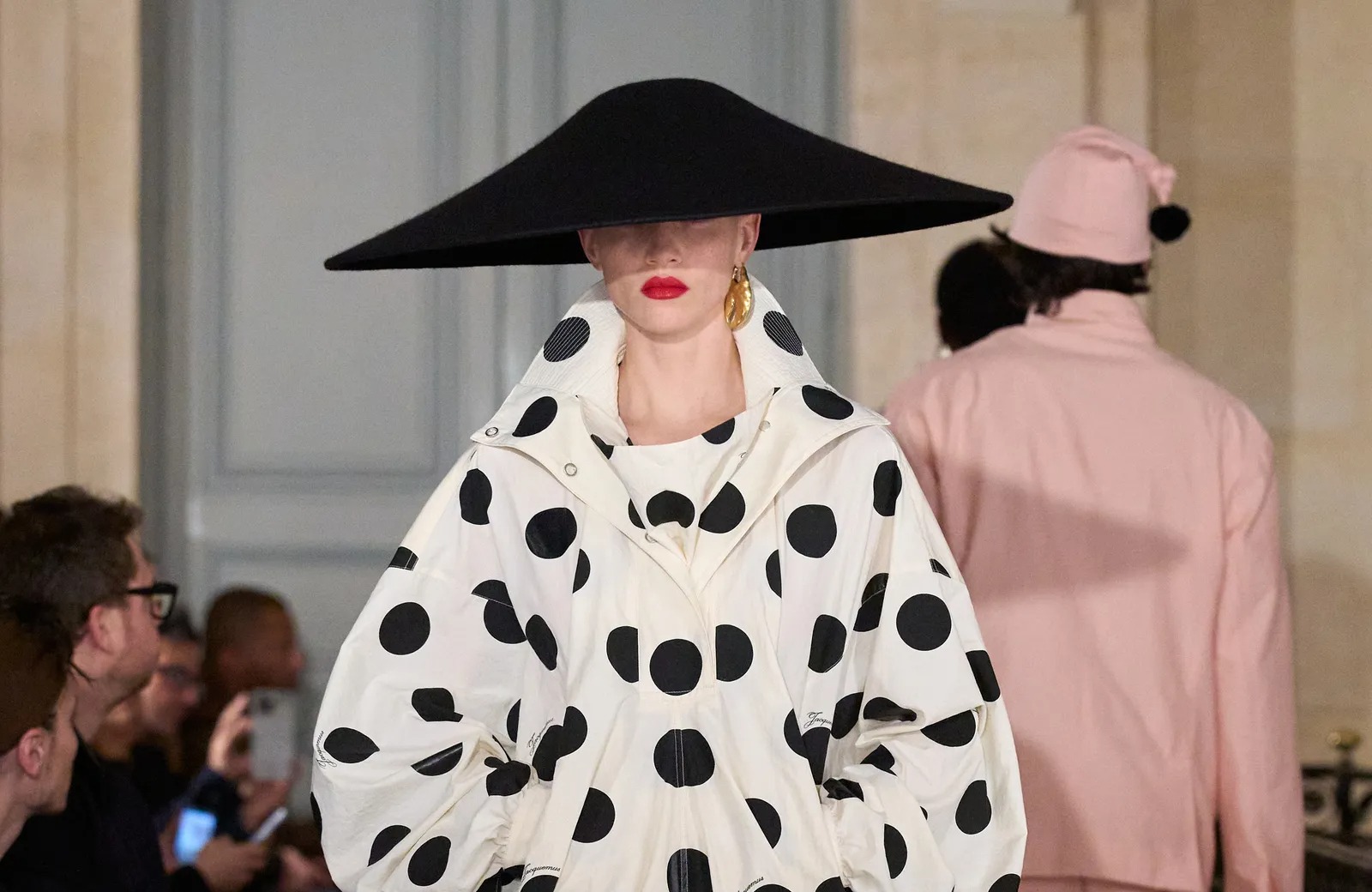 Čitajući brojne recenzije nakon revije, zapamtila sam rečenicu da ova kolekcija izgleda kao Jacquemus i nijedan drugi brend, što je u vrijeme masovne mode te vrlo sličnih narativa i estetika možda i najvrijedniji kompliment. Reinterpretirajući geometrijske oblike po kojima je brend postao prepoznatljiv, kolekcija ponovno osmišljava svoje kultne točkice i pruge, podižući skulpturalni dizajn na potpuno novu razinu. Jacquemusova silueta sada doseže retro formalnost, naglašenu prepoznatljivim ekstravagantnim šeširima i gracioznim načinom na koji su se modeli kretali niz mramorne stepenice muzeja, s rukama na bokovima. Da, ekstravagancija je u modi, ali ovdje ona prati prirodnu liniju tijela, s haljinama u obliku pješčanog sata, ali i ribe, izvedenima pomoću posebne intarsia tehnike, aluzije na zvijezdu osamdesetih Jean Charlesa de Castelbajaca. Razigranosti kolekcije pridonose šarene 3D točkice koje zapravo oponašaju konfete s čupercima na rubovima. „Poruka je bila napraviti nešto zabavno“, rekao je dizajner. „To mi je ove godine neka vrsta opsesije. Želim da se svi zabave i da se ne shvaćamo previše ozbiljno.“ I ja, Simon!