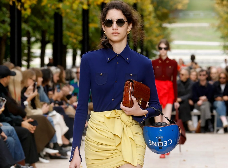 Kao jedna od ključnih boja ove godine, plava se pojavljuje u tamnoplavim nijansama i spaja s mekšim tonom žute kako bi stvorila elegantne lookove. Za Céline je Michael Rider posegnuo za mini-suknjom u sunčanoj nijansi, koju je uskladio s polo majicom duboke plave boje.