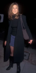 Jennifer Aniston također je snažno utjecala na generaciju 1990-ih. Tada zvijezda kultne serije Friends, glumica je inspirirala podjednako svojim outfitima na ekranu kao i tijekom javnih pojavljivanja. U ovom looku, birala je model prožet plavom nijansom, koji je upotpunila dolčevitom, dugim crnim kaputom i visokim čizmama. Smeđa heklana torba zaokružila je njezinu siluetu.