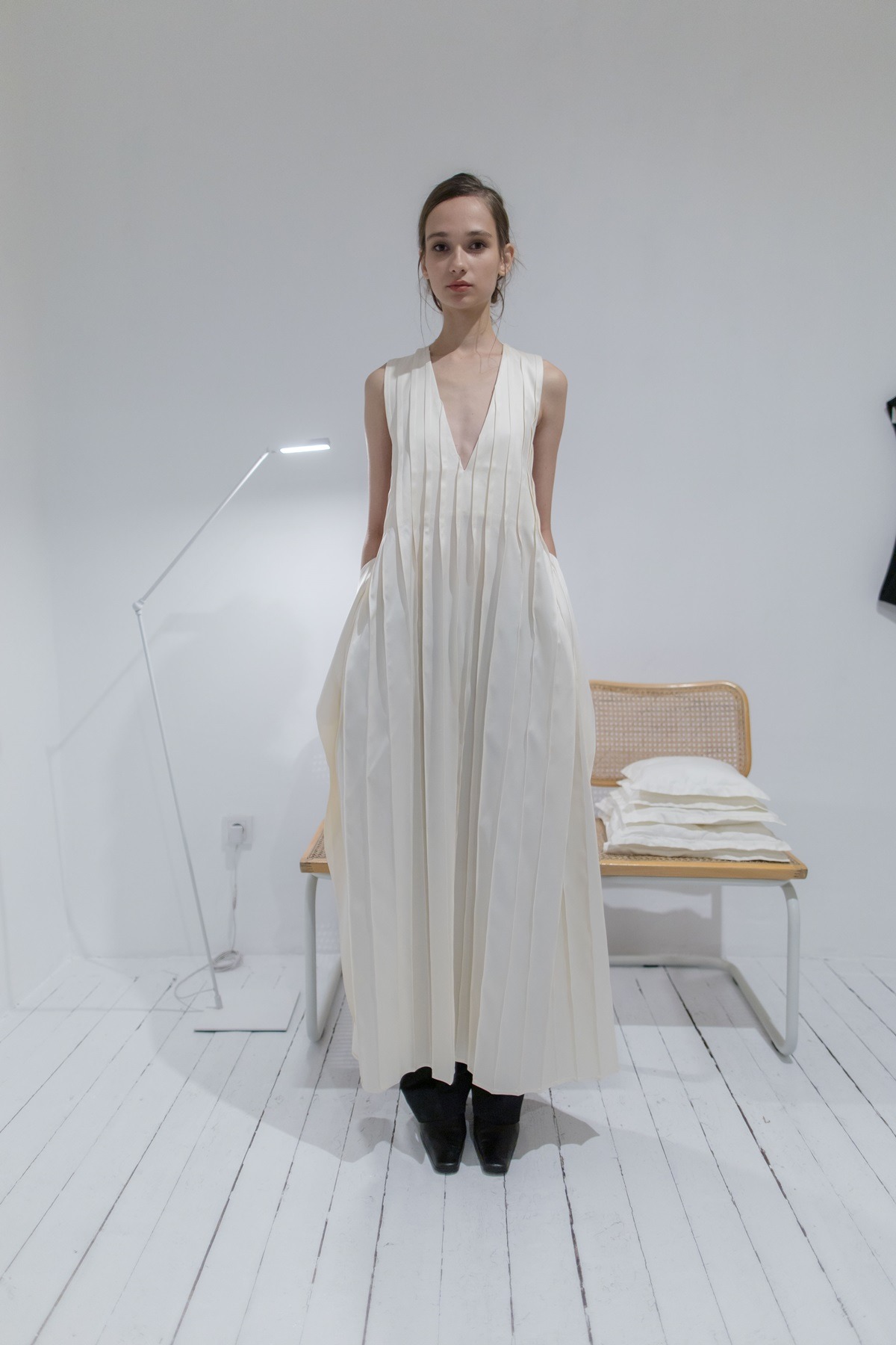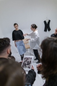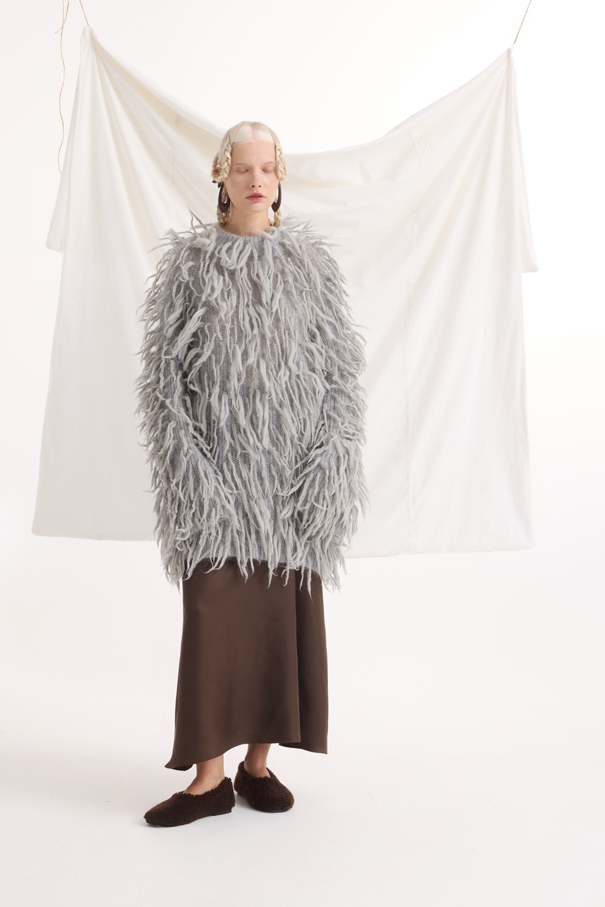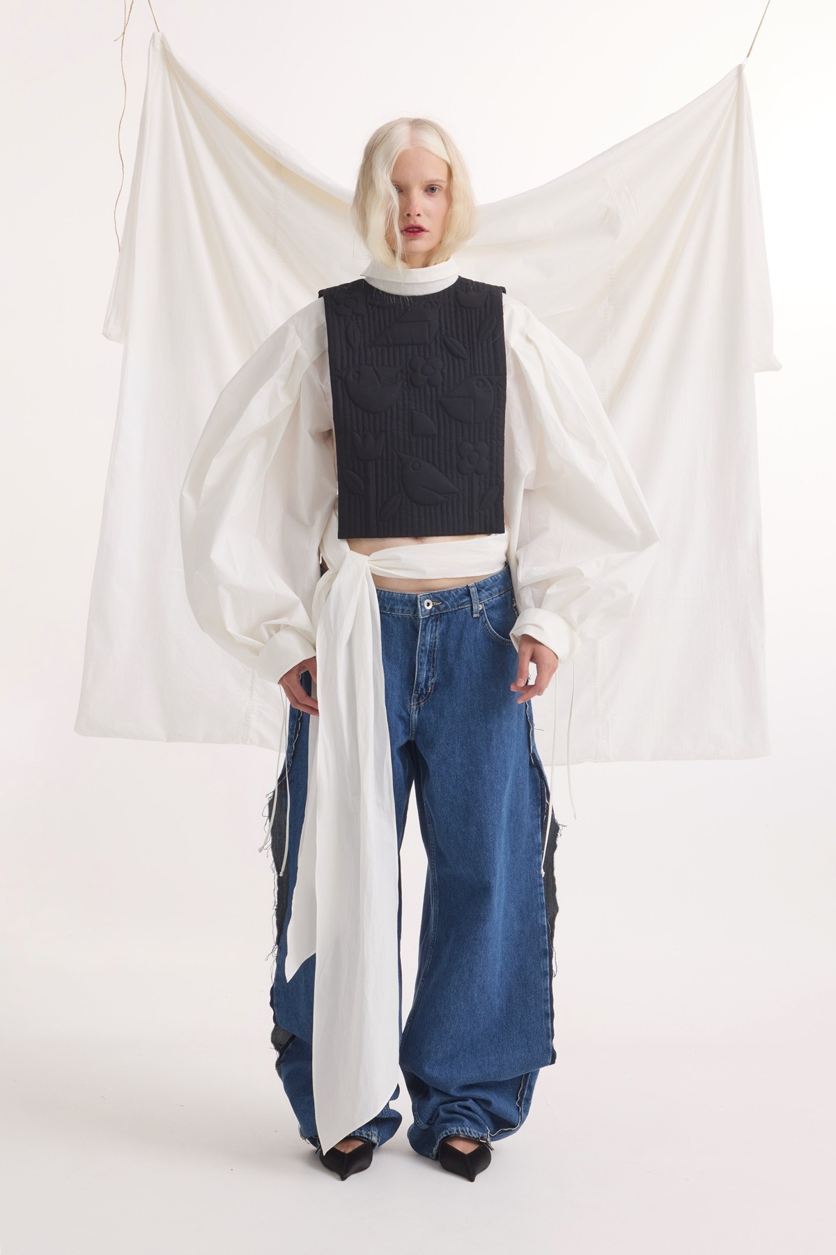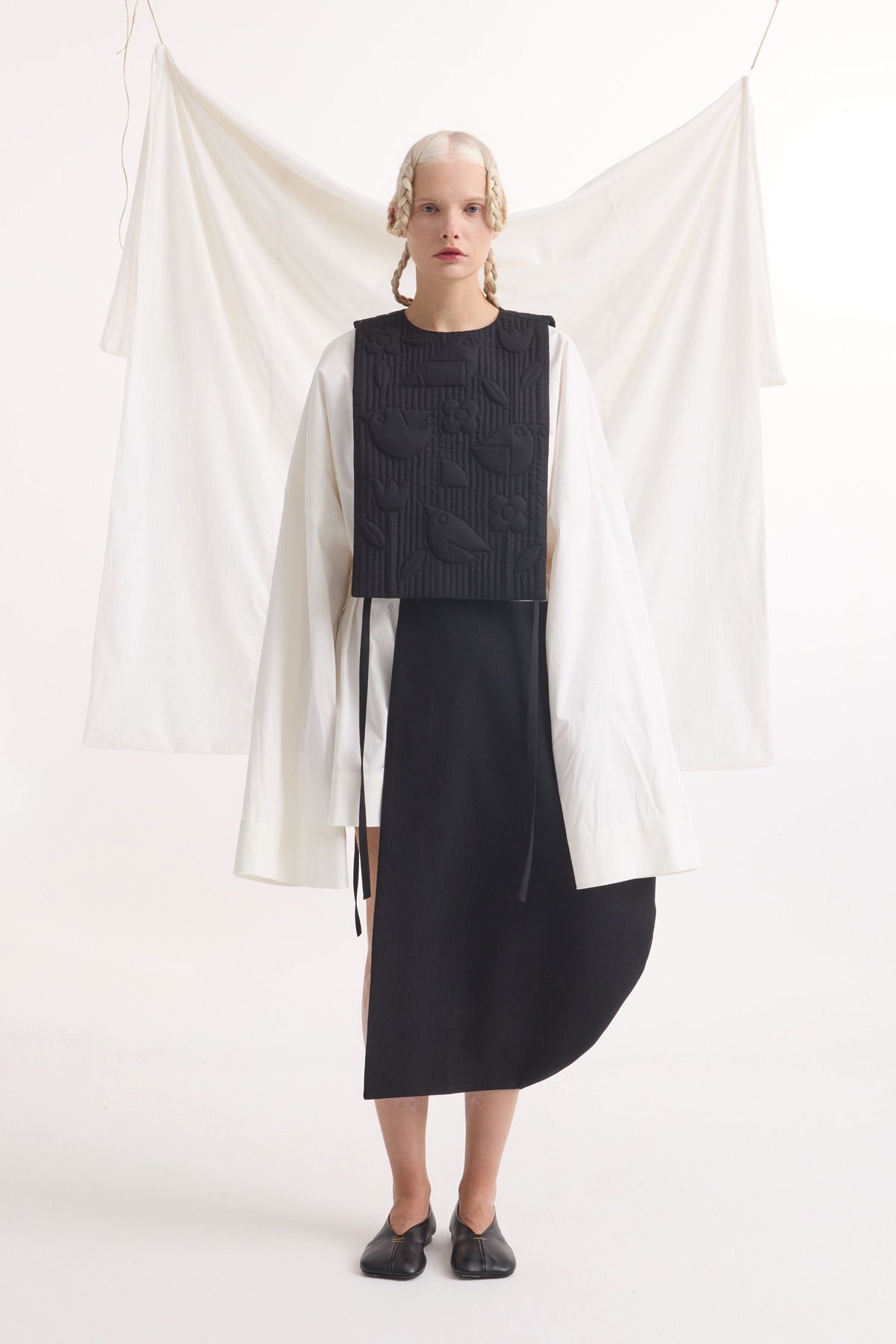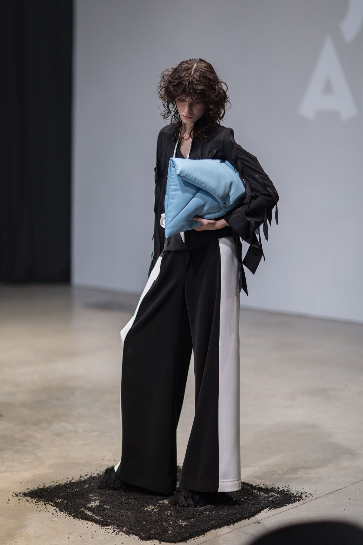 Collection 07 logični je produžetak njihova rada obilježen traganjem za nečim novim unutar onoga što smatramo poznatim. Darya nam objašnjava kako je jedan od komada inspiriran načinom na koji je kao dijete u majici nosila voće i orašaste plodove koje bi skupila u prirodi. Upravo je iz te dječje improvizirane „torbe“ — kakvu smo svi barem jednom „nosili“ kad smo poželjeli sačuvati ono što smo slučajno pronašli — nastao dizajn koji se, zahvaljujući gumbima i dodatnim krojnim elementima, transformira u multifunkcionalan komad koji se može nositi na više načina. Djetinjstvo, nostalgija za odrastanjem kao i mjesto u kojem žive i stvaraju nezaobilazan su dio njihovog rada.