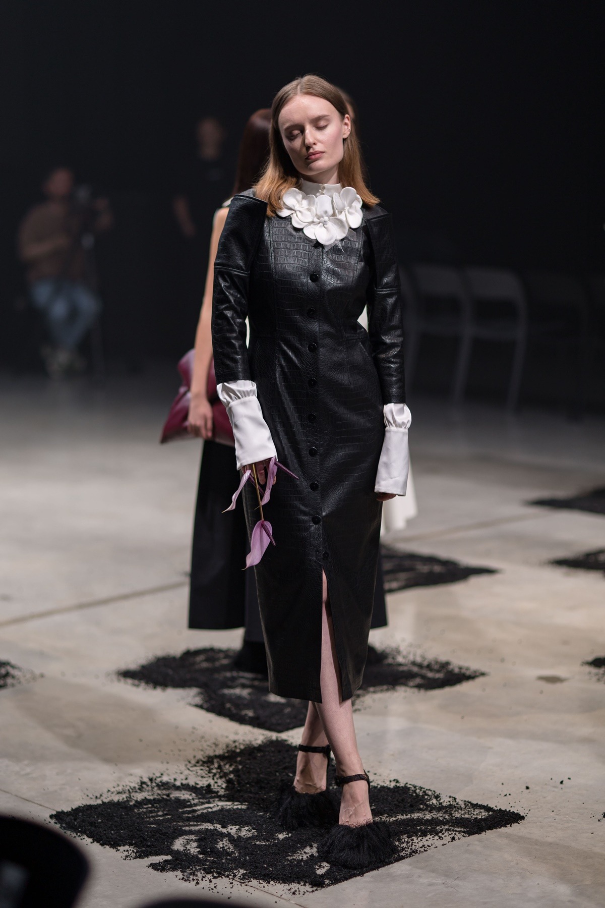 Julia Allert jedan je od onih brendova koji su odmah privukli moju pažnju. Iako ih na tjednoj bazi, a posebice kada putujem, upoznajem bezbroj, instantna povezanost sa estetikom i sentimentom nekog brenda ne događa se često. Julia je svoju novu kolekciju naziva Timeless Frames predstavila u Mediacoru pretvorivši pistu u šahovsku ploču. Prije nego što su počeli koračati uzduž piste imala sam priliku promotriti sve total lookove na modelima koji su mirno stajali iščekujući početak showa. Kao što zaljubljenici u umjetnost stoje ispred eksponata u galerijama, proučavala sam svaki detalj. Delikatni motiv cvijeta i razigrane teksture ispreplitali su se kroz priču, stvarajući očaravajuću igru kontrasta sa strukturiranim siluetama. Iako dominantno u kombinaciji crne i bijele – spoju koji asocira na šahovsku ploču – svaki je look bio savršeno zaokružen detaljima poput mekanih, voluminoznih pillow torbi, statement cipela, “kravata” s floralnim završetkom, ovratnika i remenja.