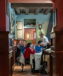 Interijer je topao, u boji drveta, i čuva intimnost mirnog razgovora. Ovdje nema pisanog jelovnika: sjednete za stol, a domaćini vam nabrajaju što se toga dana kuha. Ne dolazite ovamo ako ste na dijeti, porcije su obilne i poštene. Usluga može biti sporija nego inače, ali okus se isplati čekati. A ako se vratite nekoliko puta, zapamtit će što volite: „Uobičajeno, molim” postaje rečenica koja vam na stol donosi omiljeno jelo.