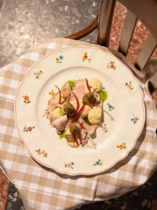 Među predjelima se ističu teleći mondeghili s mortadelom, mekanim krumpirom i zelenim umakom, dok je među prvim jelima apsolutna zvijezda chitarrino s dvostrukim inćunima (svježe srdele, šafran, grožđice, pinjoli i tostirani kruh), koji je postao jedno od prepoznatljivih jela kuće. Obrok završava Libertyramisùom, kremom od mascarponea, semifredom od kave i crumbleom.