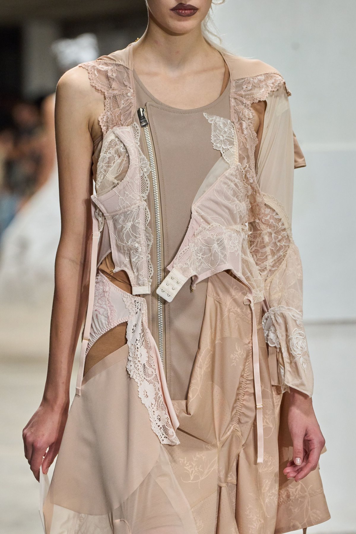 Nošenje donjeg rublja tako da pritom nije skriveno već da predstavlja ravnopravni dio (vidljivog) stylinga, odavno nije novost, a mogli bismo čak utvrditi da je i prestalo biti kontroverznim. Grudnjaci koji proviruju ispod oversized blazera ili se naziru ispod naked haljina, kao i gaćice u službi pantless trenda odavno su nas naviknuli da donje rublje nije nešto što ćemo čuvati od očiju slučajnih prolaznika. No iako sam prihvatila da moj vintage čipkasti grudnjak ipod prozirnog topa može izgledati i stylish i koketno, nije mi palo na pamet da taj isti grudnjak nosim kao modni dodatak. Vaquera je tu ideju dovela do vrhunca. U svojoj kolekciji za jesen 2025 predstavila je goleme grudnjake vintage estetike koje se nose poput tijare. Junya Watanabe je bio nešto suptilniji no njegov je dizajn slijedio sličnu logiku – svoju haljinu iz kolekcije za proljeće ukrasio je grudnjacima koji s nje vise poput ukrasa.