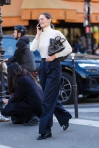 Krojačke plave hlače susreću eleganciju bijele dolčevite u bezvremenskoj ravnoteži. Look koji počiva na jednostavnosti, ali i preciznosti: čiste linije, jasne boje, bez viška. Savršen za dane kada želite izgledati besprijekorno bez prevelikog truda, s onom vrstom elegancije koja uvijek prolazi, pa i u uredu.