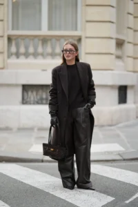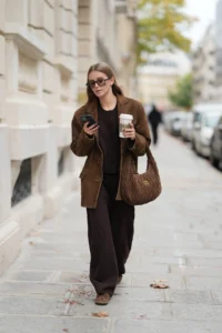 Čar ton-sur-ton kombinacije najbolje se vidi u ovom total looku u boji čokolade: igra tekstura više nego boja. Mekani pulover i kožne hlače skladno se nadopunjuju, dok dugi kaput zaokružuje outfit s elegantnom lakoćom. To je kombinacija koja odiše dosljednošću i snagom, dokaz da monokromatski look nikako ne mora biti monoton.
