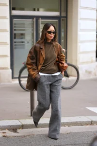Smeđi pulover spaja se sa sivim vunenim hlačama u igri tekstura i toplih tonova, savršenoj jesenskoj kombinaciji. Efekt je opušten, ali profinjen, s ravnotežom koja miješa udobnost i preciznost. Kožni sako dodaje karakter i boju kontinuiteta, pretvarajući jednostavan spoj u look pun nijansi i osobnosti.