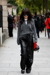 Sivi pleteni pulover s uzorkom pletenica susreće sjaj crnih kožnih hlača u savršeno odmjerenom kontrastu mekoće i snage. Rezultat je upečatljiv, ali sofisticiran, s elegancijom koja proizlazi iz tekstura i proporcija. Dodaci nadopunjuju karakter outfita kojem ne treba mnogo da bi privukao pažnju.