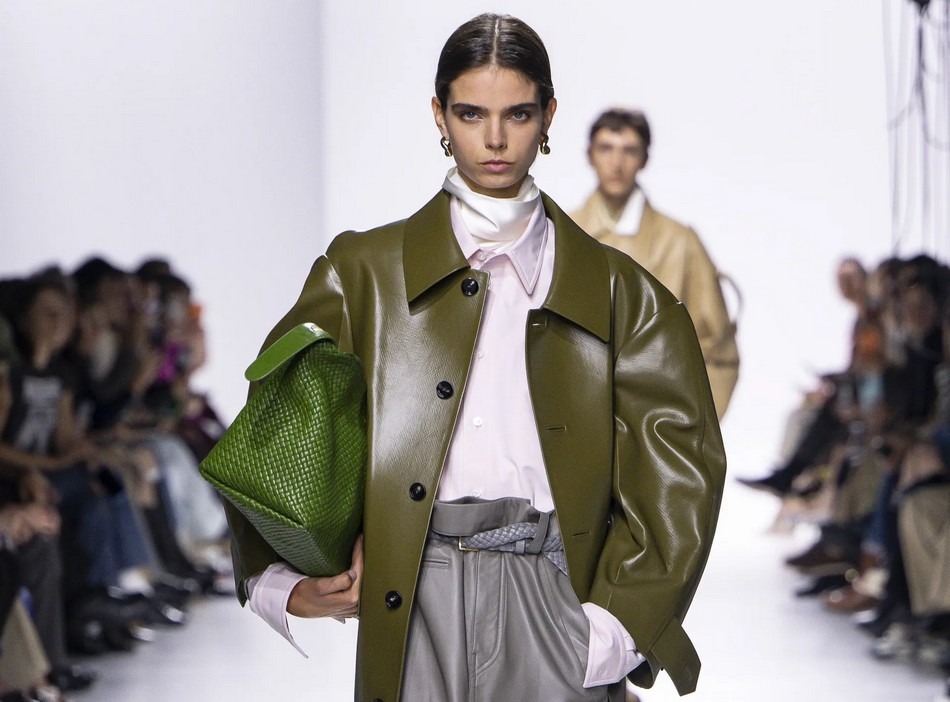 Košulja, bezvremenski komad garderobe, dobiva moderniji karakter kada je obojena u ružičasto. Bottega Veneta se odvažila na kombinaciju boja i materijala kako bi predstavila ovaj komad. Na pisti se ružičasta košulja kombinirala sa sivom kožnom suknjom, satenskim topom te zelenim kaputom i torbom. Skup nijansi koje su se savršeno nadopunjavale s trendi bojom.