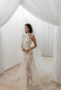 Samo dan nakon zaruka, u nedjelju, Selena Gomez podijelila je s pratiteljima na Instagramu prve službene fotografije svoje vjenčanice. Zvijezda, koja je većinu detalja uspjela zadržati u strogoj privatnosti, iznenadila je ekskluzivnim modelom iz Ralph Lauren Collectiona, koji je spajao klasični romantizam i suvremeni dodir. Haljina od svilenog satena s dvostrukom površinom imala je halter izrez s nježnim makrame ovratnikom, dodatno ukrašen višedimenzionalnim vezom. Otkrivala je ramena i padala do donjeg dijela leđa, savršeno balansirajući senzualnost i sofisticiranost. Silueta se širila u bogatu suknju s raskošnim zaobljenim šlepom – idealnu za fotografije koje je Selena snimila s Bennyjem u vrtovima imanja gdje se slavlje održalo.