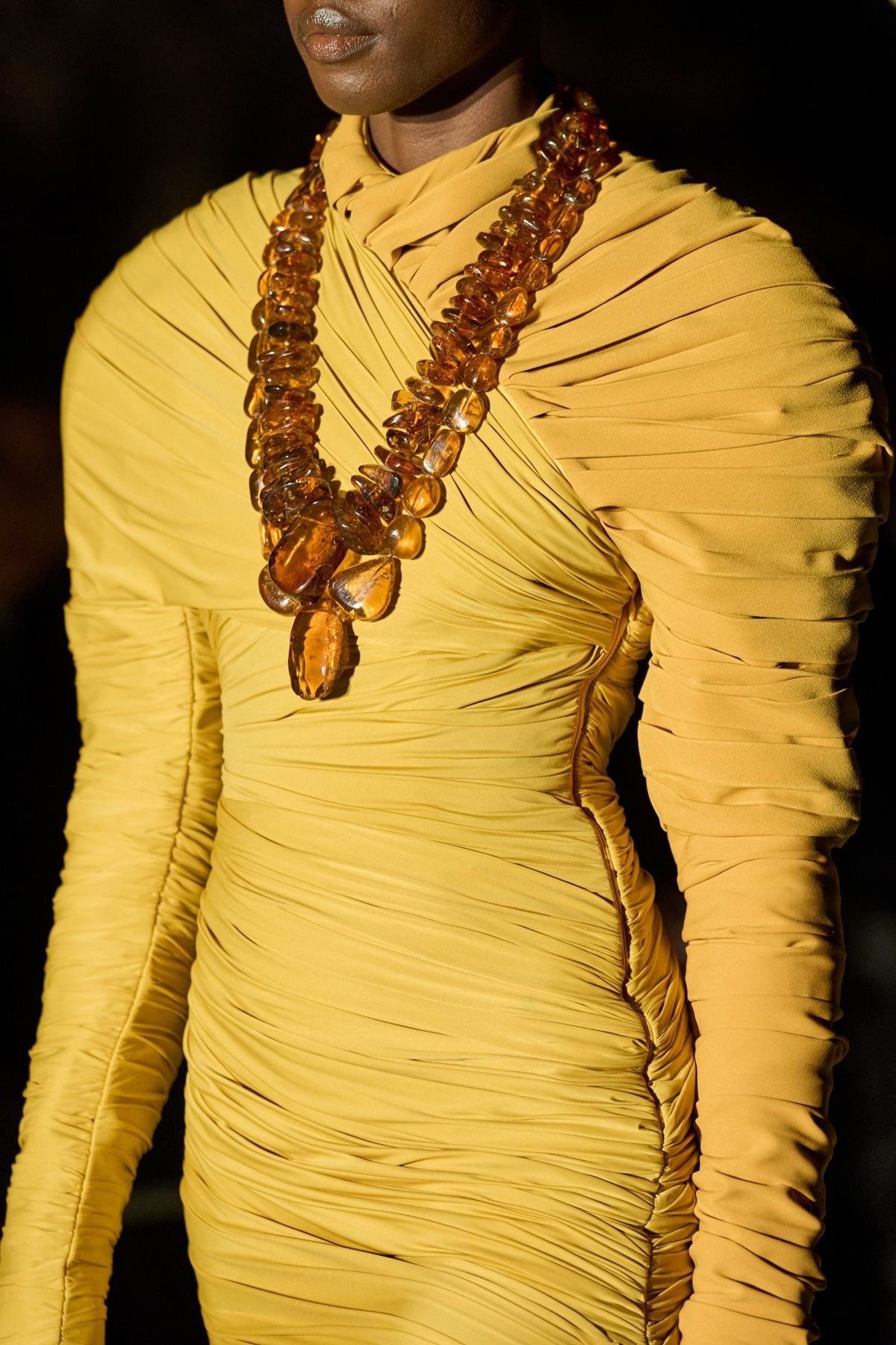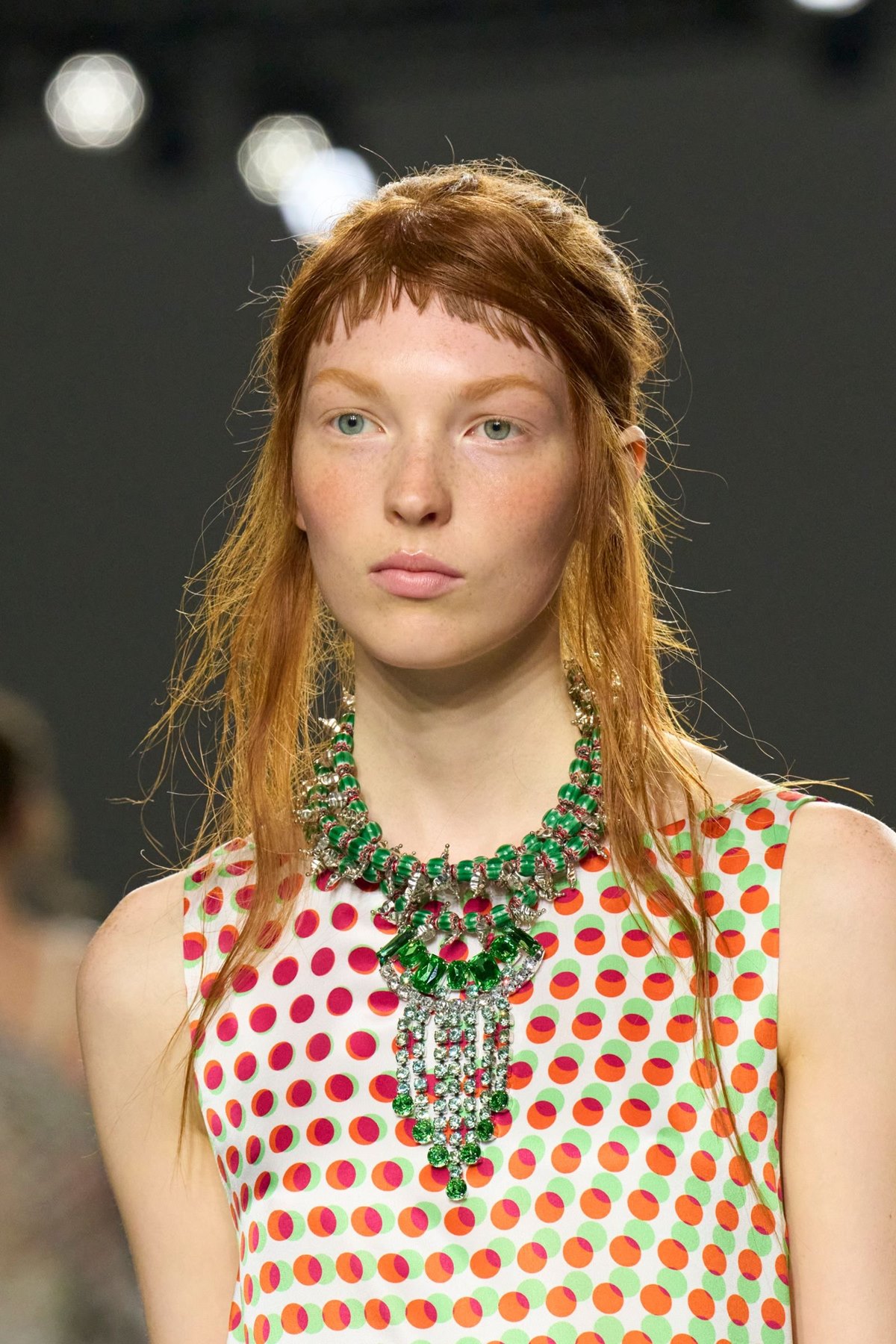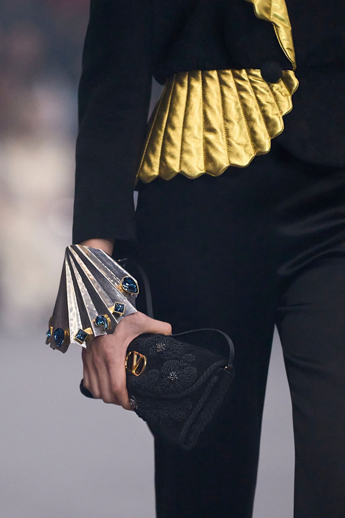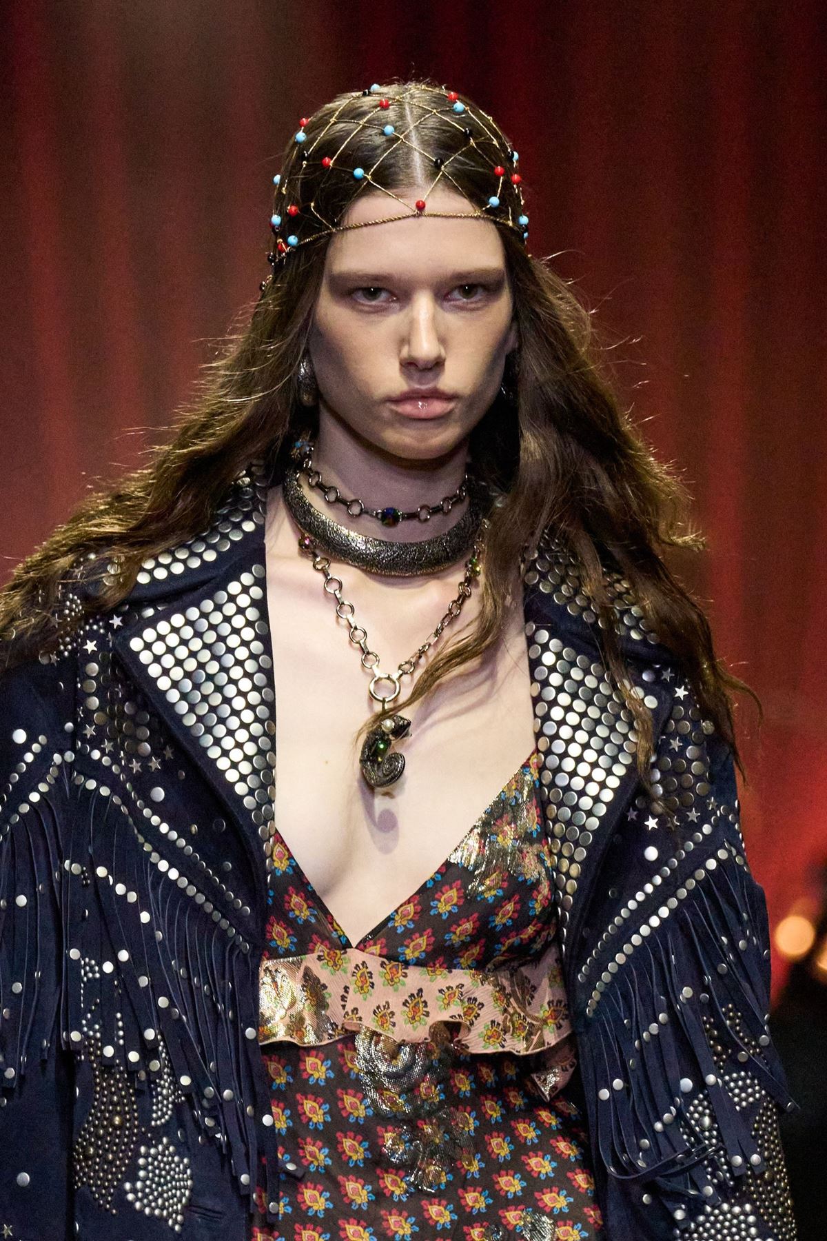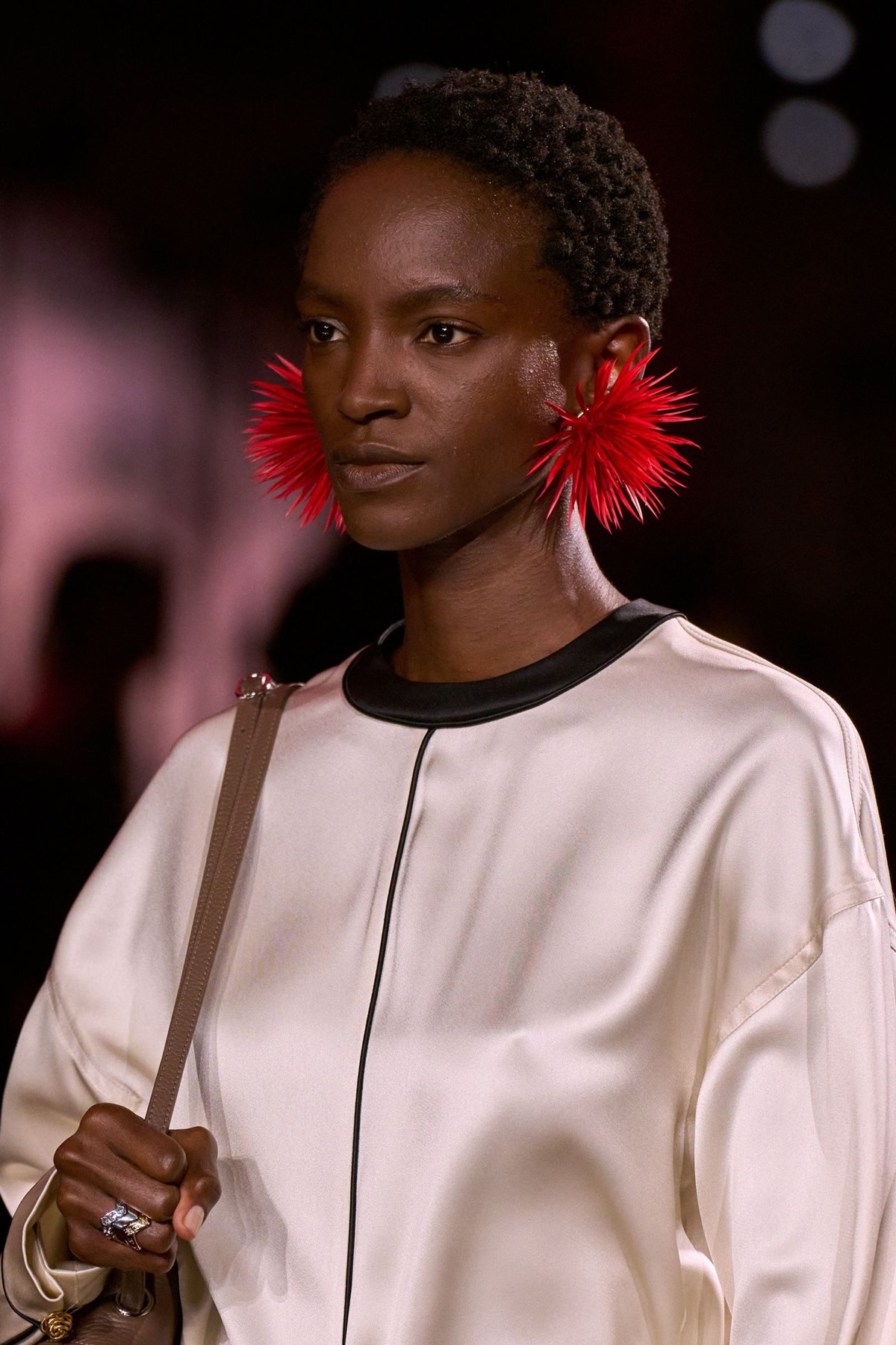 Slojevito stiliziranje nakita svidjelo se i Olivieru Rousteingu u Balmainu, Nadège Vanhée u Hermèsu te Michaelu Korsu, no u njihovoj interpretaciji s izraženijim boho prizvukom. Ogrlice nalik festivalskom nakitu bile su trend i kod Célinea i Tory Burch, dok su se kod Givenchyja i Lanvina perle pretvorile u drago kamenje i kristale, boemski duh ustupio je mjesto raskoši. Za još dekadentniji dojam vrijedi pogledati Saint Laurent i Gucci, gdje su komadi više nalikovali muzejskim krunskim draguljima nego klasičnim dodacima s piste. Na svom debitantskom nastupu za Chanel, Matthieu Blazy predstavio je i bisere u duhu Coco te miješane metale isprepletene pređom i koncem – još jednu ključnu priču nakita ove sezone. Ipak, najveći dojam ostavile su njegove vatromet naušnice. Pažnju su privukli i leptiri Alessandra Michelea za Valentino.