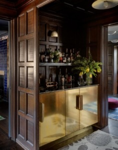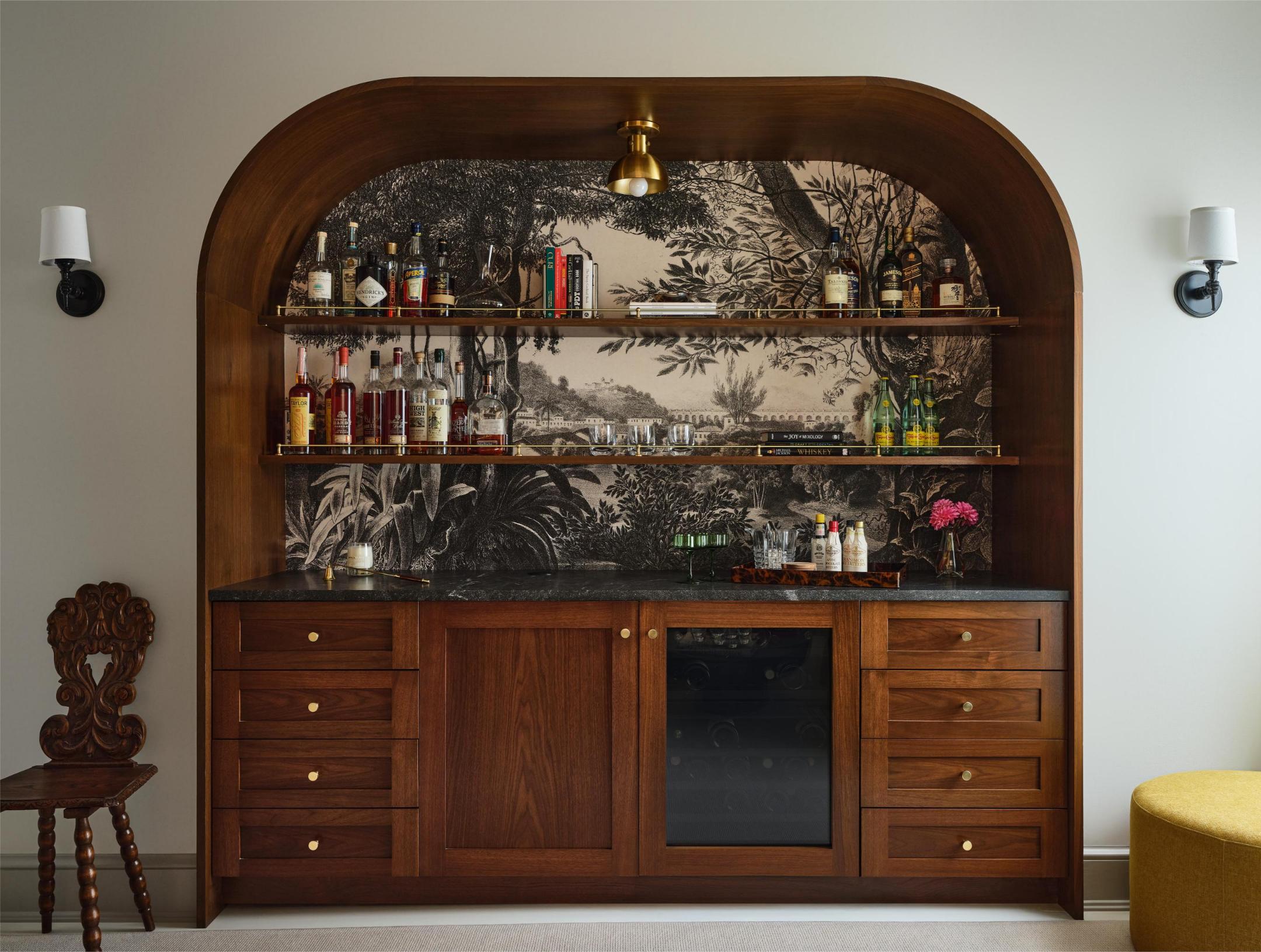 Dizajnerica Zoë Feldman poznata je po sposobnosti da spoji moderni senzibilitet s klasičnim dizajnerskim elementima pa se tako kod nje redovito nađu različite kombinacije kućnih barova. U povijesnoj kući u Washingtonu, dizajnirala je elegantni ugrađeni bar sa zakrivljenim drvenim lukom, staklenim vitrinama, orahovim detaljima i ugrađenim osvjetljenjem koje ističe boce vina i barware.