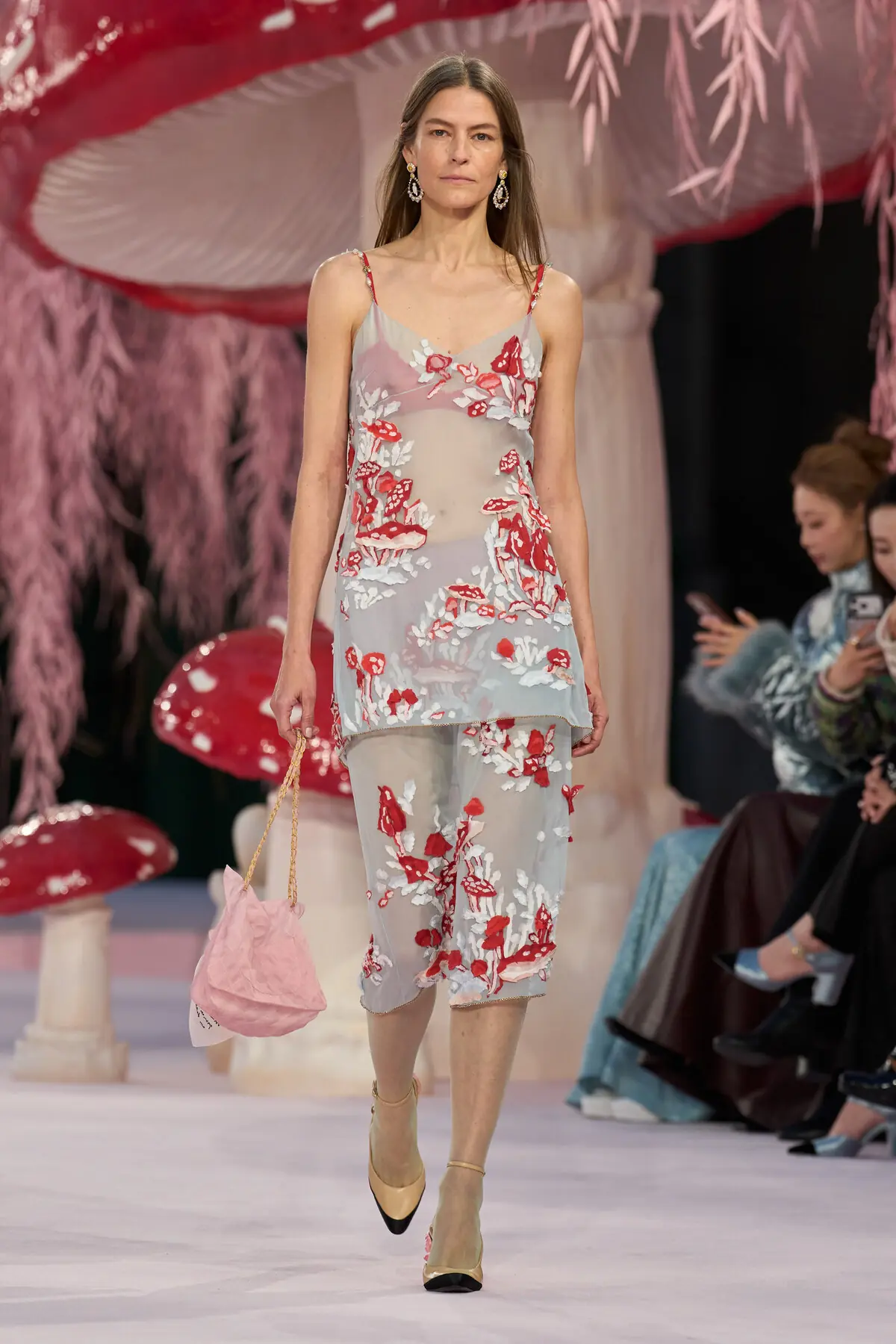 Attention was also drawn to silhouettes that are somewhat unusual for Chanel, yet entirely in harmony with the collection’s enchanted atmosphere. There were pieces made of mesh so delicate they seemed to be crafted from glass, black creations that stood in stark contrast to the pastel setting of the Grand Palais, yet were executed so skillfully that they evoked dark, enchanted plants in a mysterious forest, as well as sculptural designs such as a mushroom-shaped dress.