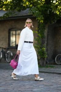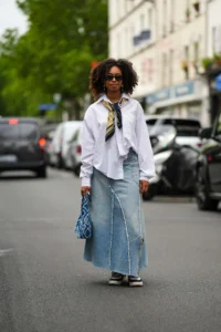 Če imate raje preproste, nevsiljive kombinacije, izberite enobarvne kombinacije, ki naravno izgledajo elegantno in minimalistično. Vaš najboljši zaveznik bo dolgo belo jeans krilo, idealen par pa je srajca ali jeans jakna v istem odtenku. Zaključek naj bo tanek pas in ravni slingback čevlji. Popolnoma bel videz izgleda čisto, urejeno in izjemno chic.