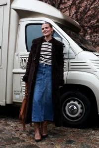 Dolga jeans krila imajo skrivnosten, rahlo weird girl pridih, ki je kot nalašč za plastenje videzov in kombiniranje različnih stilov v en outfit, tako kot v tej ideji. Street style priporoča preprost, minimalističen model krila kot osrednji del kombinacije. Ne omejujte domišljije, kombinacijo popestrite z visokimi rjavimi škornji s kvadratnim nosom, če pa so v motorističnem stilu, pa še toliko bolje. Združite jih s črtasto polo majico in oversized plaščem z volneno podlogo. Takole izgleda drzna, a hkrati edinstvena kombinacija, ki bi jo Bella Hadid zagotovo odobrila.