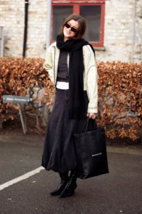 Čeprav jeans krila pogosto povezujemo s sproščenimi dnevnimi kombinacijami, so lahko tudi zaključni pridih sofisticiranega, plastenega outfita. Modne poznavalke to dokazujejo z ustvarjanjem večplastnih kombinacij, ki se popolnoma prilegajo sezoni in izstopajo same po sebi. Izberite črno balonsko silhueto ali A-kroj, ki lepo oblikuje vašo postavo. Po potrebi dodajte dvoslojne puloverje, jakne in celo eleganten plašč. Na koncu si obujte trendovski hit sezone: škornje, bodisi tiste s pridihom estetike šestdesetih, kot so Miu Miu, bodisi kitten-heel modele, kot je Toteme.