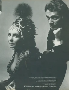 Richard Burton z Elizabeth Taylor “v črnem taftu in čipki Valentina, frizura Alexandre in z bogastvom diamantov in smaragdov.” Fotografiral Cecil Beaton, Vogue, 15. januar 1972.