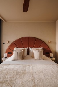 “Eden ključnih elementov projekta po meri je postelja, zasnovana kot skulpturalna osrednja točka. Njeno ukrivljeno oblazinjeno vzglavje vzbuja občutek sončnega zahoda nad Jadranskim morjem in služi tako kot funkcionalen dizajerski element kot tudi kot poetična podrobnost v sobah za goste.”