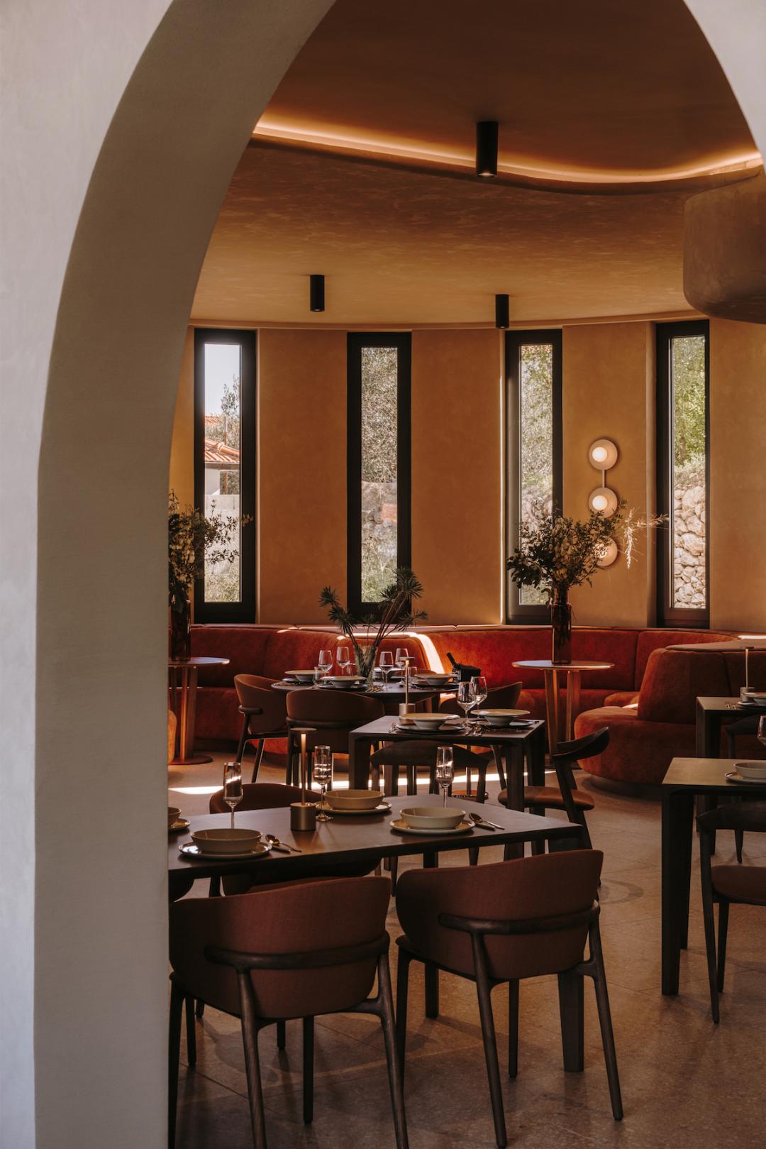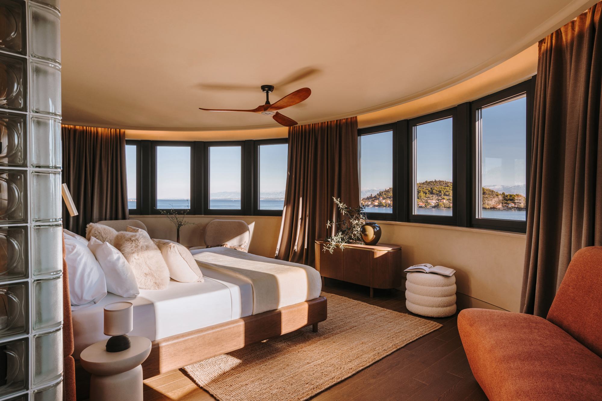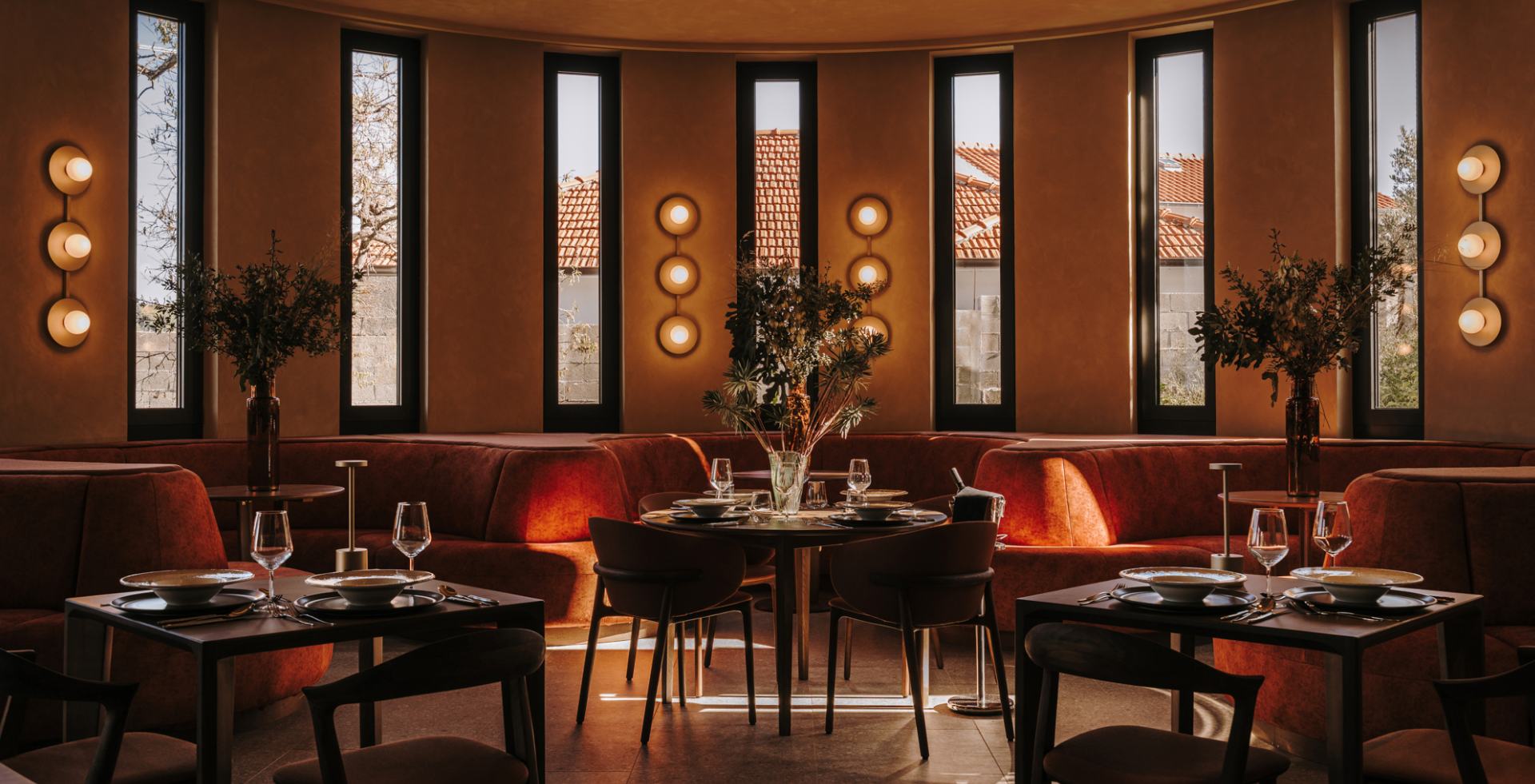 Notranji koncept temelji na dialogu med mediteransko nostalgijo sedemdesetih let prejšnjega stoletja in jadransko obalno pokrajino, ki preoblikuje spomin v sodobno gostoljubno izkušnjo. “Zasnova črpa navdih iz estetskega jezika sedemdesetih let prejšnjega stoletja, ki je bil na novo interpretiran na prefinjen in sodoben način. Elementi iz steklene opeke, topli zemeljski toni in mehke, zaobljene oblike vzbujajo optimizem in materialnost tistega obdobja, hkrati pa ostajajo brezčasni in subtilni,” mi povedo iz studia Rôck&Villa, pri čemer poudarijo ravnovesje retro vplivov. “Uravnoteženi so z materiali in teksturami, ki neposredno odražajo jadranski in mediteranski kontekst: naravni kamen, les, taktilni tekstil in paleta, ki jo navdihujejo sonce, pesek in morje.”