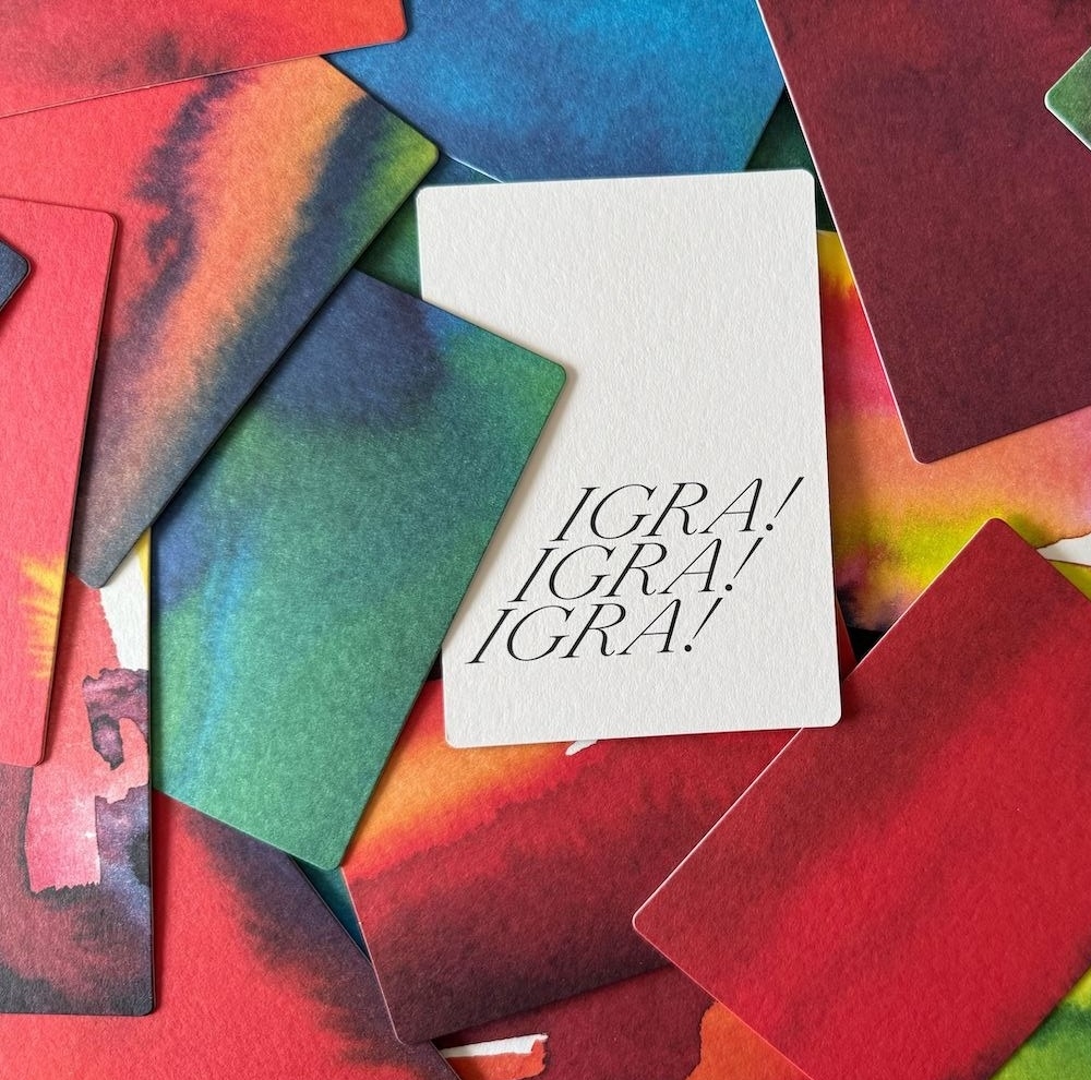 Kartice za introspekcijo, ki sem jih uporabila, so Gathering Cards Tatjane Grozdanić Begović, arhitektke, ki jih je sredi decembra lani lansirala kot orodje za razmislek, spodbudo za ustvarjalno razmišljanje ali povezovanje z drugimi v odprtem pogovoru in deljenju izkušenj ali spoznanj. Vsaka kartica vsebuje le eno besedo ali zelo kratek stavek, hrbtna stran vsake kartice pa je pobarvana z akvareli v vizualno privlačnih odtenkih.