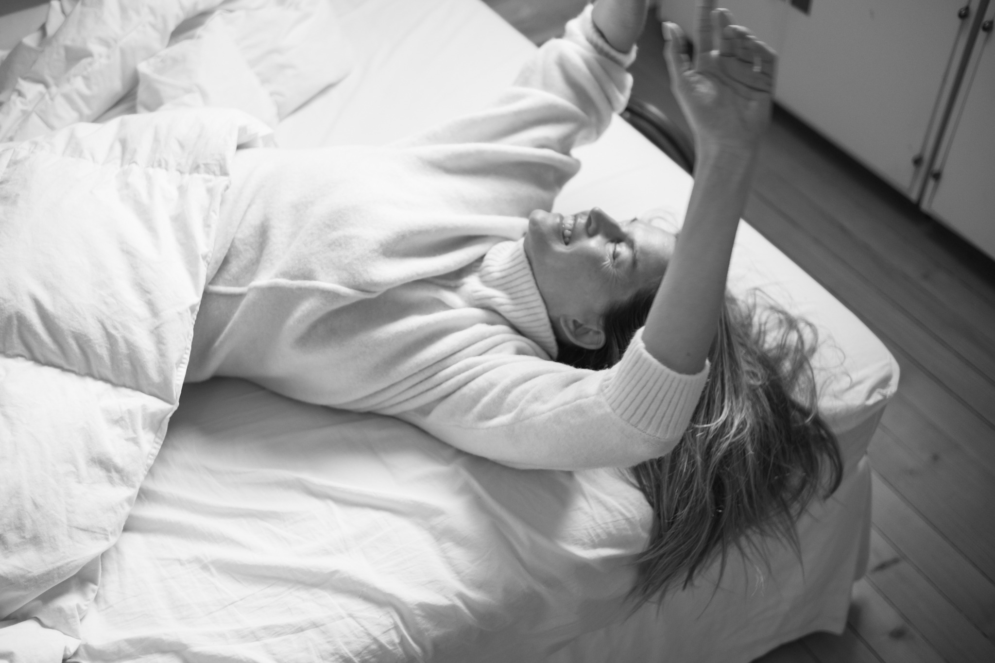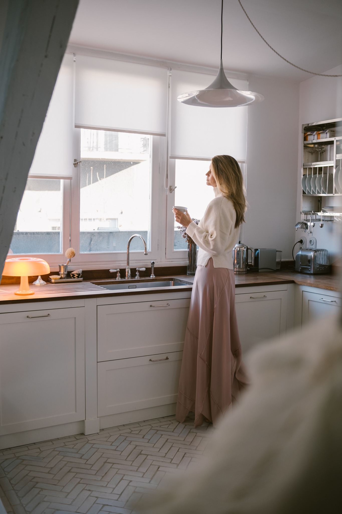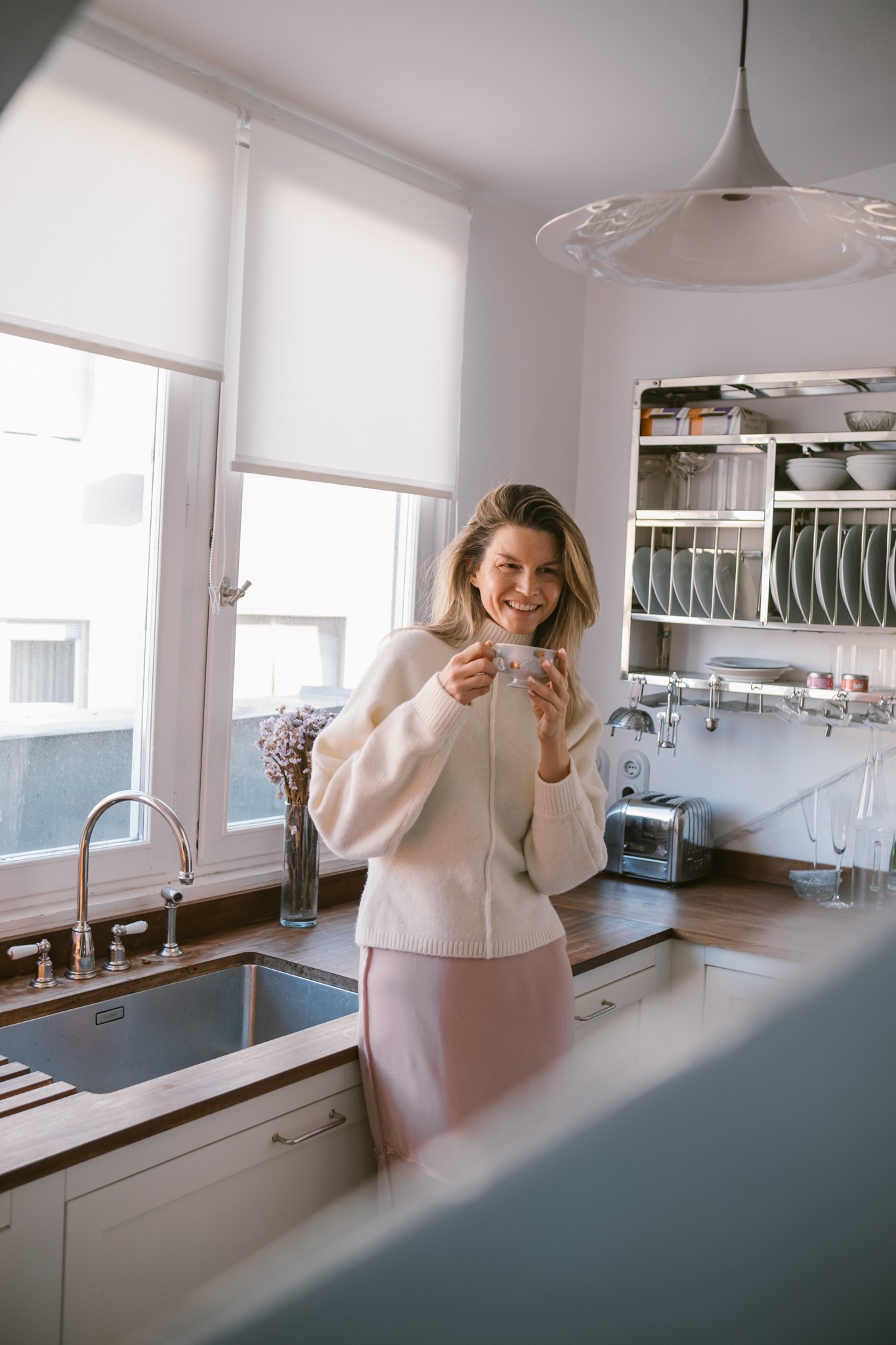 Jelena začne jutro z nežnim ritualom, sledi osnovnim priporočilom wellbeing strokovnjakov – dan naj se začne v miru in tišini. Nekaj globokih vdihov, izdihov in raztezanja v postelji ji da čas, da se počasi prebudi. Nato gre v kuhinjo, kjer spije skodelico čaja, kar ji dvigne energijo in zbistri misli.