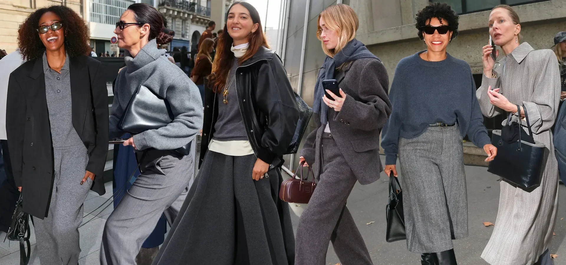 Prvotno imenovana groutfit, ta povsem siva kombinacija mnoge spominja na dolgočasne trenirke ali zastarele poslovne uniforme. Toda ta subtilna barva je veliko več kot le dolgočasna pisarniška klasika. Jesenske modne revije za leto 2025 so podale močne argumente v prid tej barvi. Gucci je to sezono predstavil osvežene obleke s krili v sivem odtenku, medtem ko je Miu Miu promovirala idejo o plastenju sivih volnenih kosov. In zunaj modnih revij pomlad/poletje 2026 v Parizu so se obiskovalci pojavili v različnih različicah groutfita, od oprijetih oblek do dolgih kril.