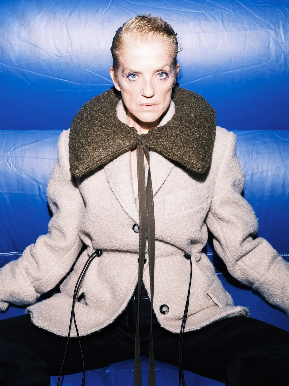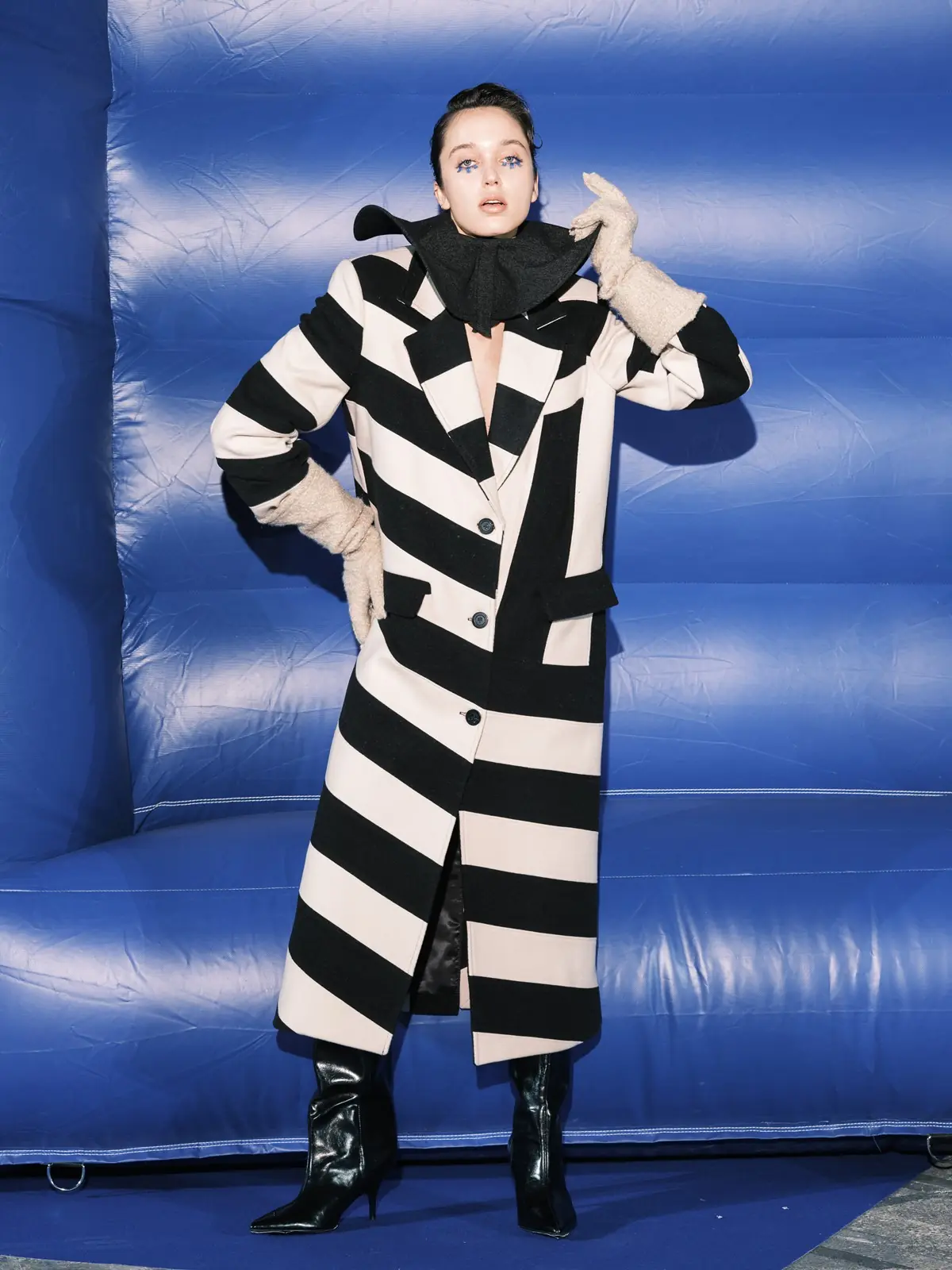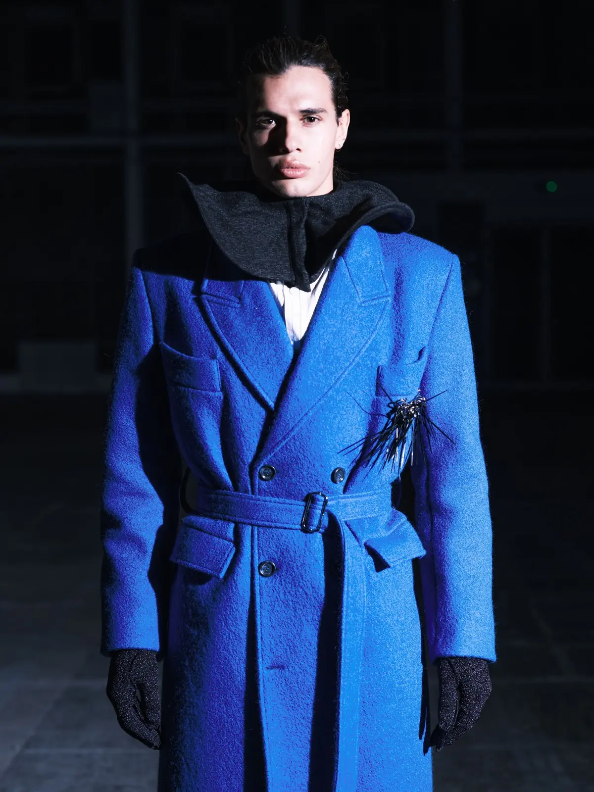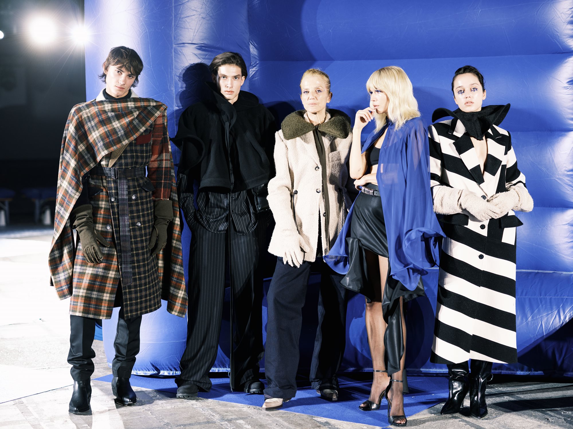 Oblikovalca Tomislav Kliškinić in Marko Šabarić sta nas povabila, da stopimo v njuno modno zgodbo za jesen/zimo 2025, ki sta jo domiselno, a tudi nekoliko otročje, poimenovala Kralj svojega gradu. Sredi sivega, prostornega betonskega paviljona je stalo nekaj, kar je sprva spominjalo na kup modrih blazin, a že s prvimi takti revije je postalo jasno, da gre za napihljiv grad, kakršne smo kot otroci našli v zabaviščnih parkih. Rada opazujem, kako ljudje reagirajo, ko jih preseneti kakšen spomin na otroštvo, in tako sem v občinstvu ujela nekaj nasmejanih in ganjenih obrazov. Zagotovo se je vsakemu v občinstvu v mislih prikradel kakšen spomin.